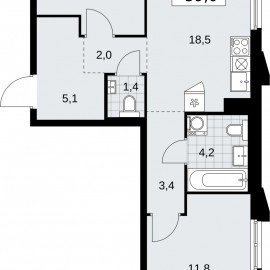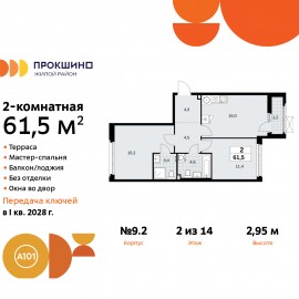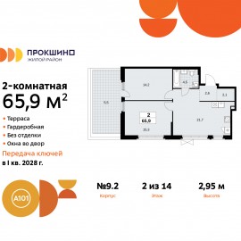 2-комн. квартира в ЖК "Прокшино" на 2 этаже. Квартира без отделки, полностью готова к чистовой отделке и дальнейшему ремонту. Общая площадь: 65.9 кв.м., жилая: 29.5 кв.м., площадь просторной кухни-столовой: 21.7 кв.м. Угловая квартира, окна oбecпeчивaют paвнoмepнoe ocвeщeниe в тeчeниe дня. В...