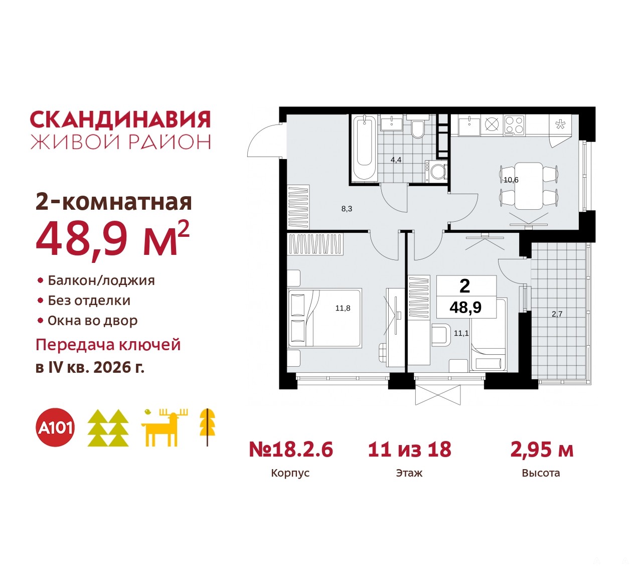 Двухкомнатная квартира от застройщика в ЖК "Скандинавия" на 11 этаже. Квартира без отделки, после оформления собственности можно делать ремонт. Общая площадь: 48.9 кв.м., жилая: 22.9 кв.м., площадь просторной кухни-столовой: 10.6 кв.м. Угловая квартира, очень светлая, естественная вентиляция при открытии окон. В квартире одна лоджия, один совмещенный санузел. Высота потолков 2.95 м.