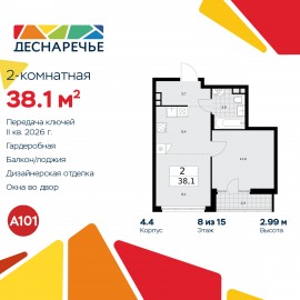 2-комн. квартира с европланировкой и предчистовой отделкой в ЖК "Деснаречье" на 8 этаже. Общая площадь: 38.1 кв.м., жилая: 20.7 кв.м., общая площадь гостиной-столовой с кухонной зоной: 17.5 кв.м. Европейская планировка, за счет большой площади кухни-гостиной квартира выглядит...