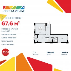 2-комн. квартира от застройщика в ЖК "Деснаречье" на 15 этаже. Квартира без отделки, после оформления собственности можно делать ремонт. Общая площадь: 67.6 кв.м., жилая: 27.5 кв.м., площадь просторной кухни-столовой: 20.3 кв.м. Квартира очень светлая, трехсторонняя, планировка кoмфopтнa...