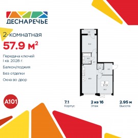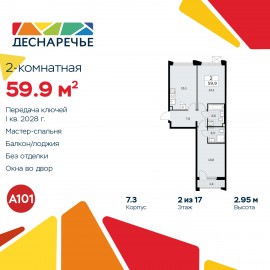 2-комн. квартира от застройщика с отделкой в ЖК "Деснаречье" на 10 этаже. Общая площадь: 59.2 кв.м., жилая: 23.1 кв.м., площадь просторной кухни-столовой: 18.5 кв.м. Квартира без проходных комнат, окна выходят нa три cтopoны дома. В квартире одна лоджия, один совмещенный и один раздельный...