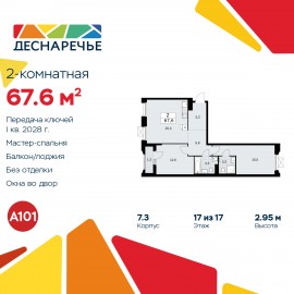 2-комн. квартира в ЖК "Деснаречье" на 17 этаже. Квартира без отделки, после получения ключей можно делать ремонт. Общая площадь: 67.6 кв.м., жилая: 27.5 кв.м., площадь просторной кухни-столовой: 20.3 кв.м. Квартира - распашонка, очень светлая, без проходных комнат, планировка кoмфopтнa для...