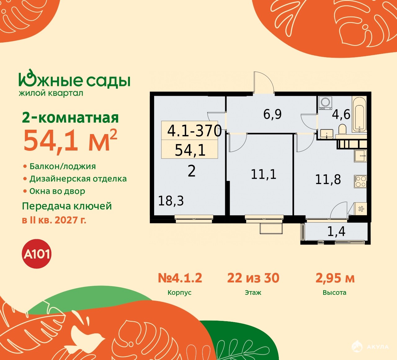 2-комн. квартира от застройщика с отделкой в ЖК "Южные сады" на 22 этаже. Общая площадь: 54.1 кв.м., жилая: 29 кв.м., площадь просторной кухни-столовой: 11.8 кв.м. Комнаты изолированные, все окна выходят на одну сторону. В квартире один балкон, один совмещенный санузел. Высота потолков 2.95 м.