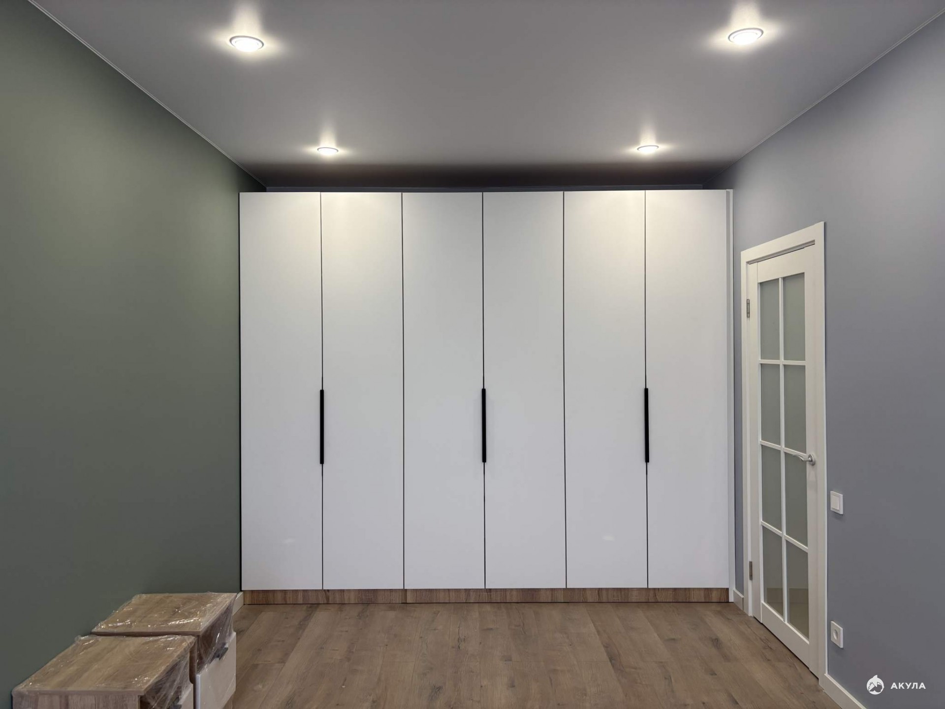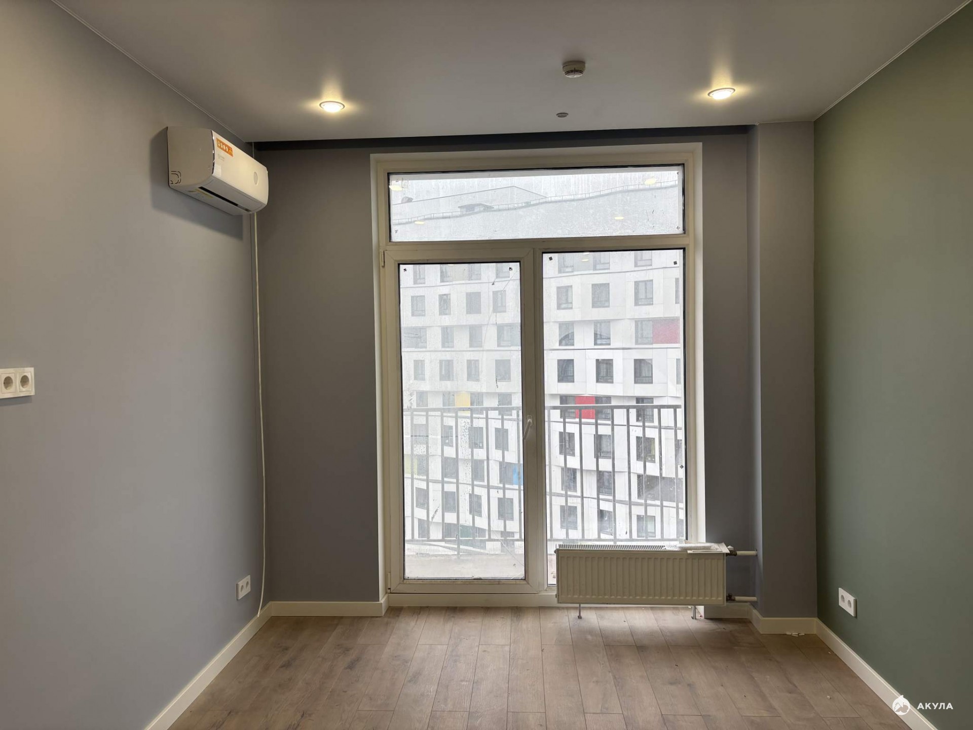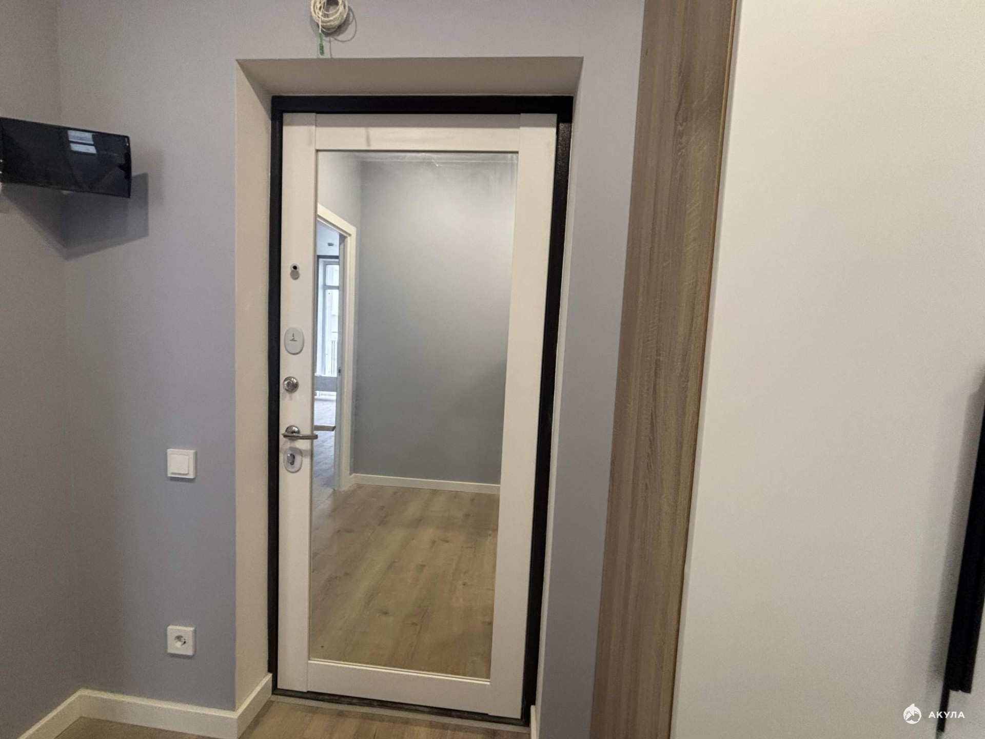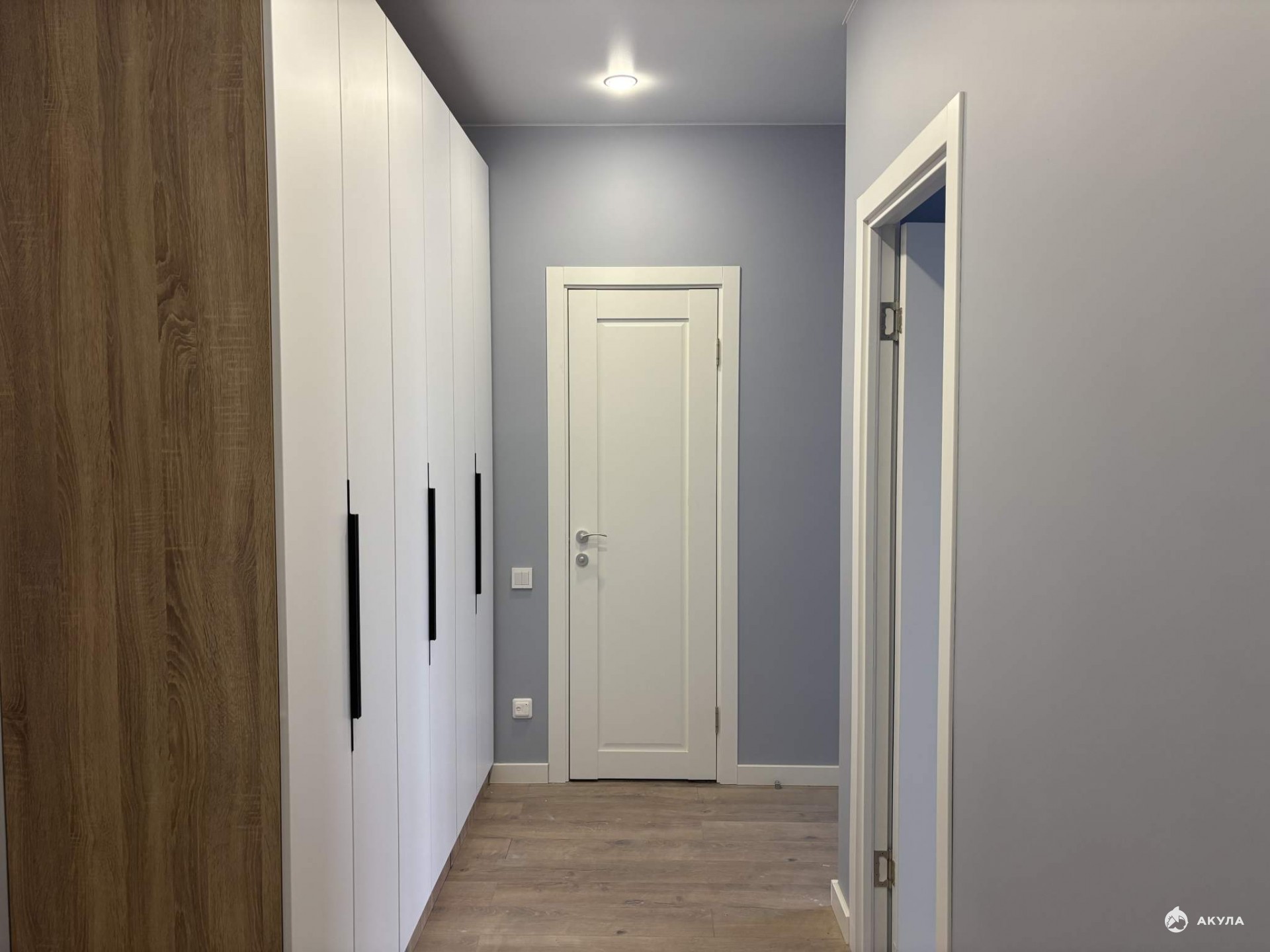 Входная дверь с зеркалом, ламинат 32 класса, натяжные потолки, обои в сдержанных тонах, межкомнатные двери, розетки, выключатели, точечные светильники, установлен кондиционер;