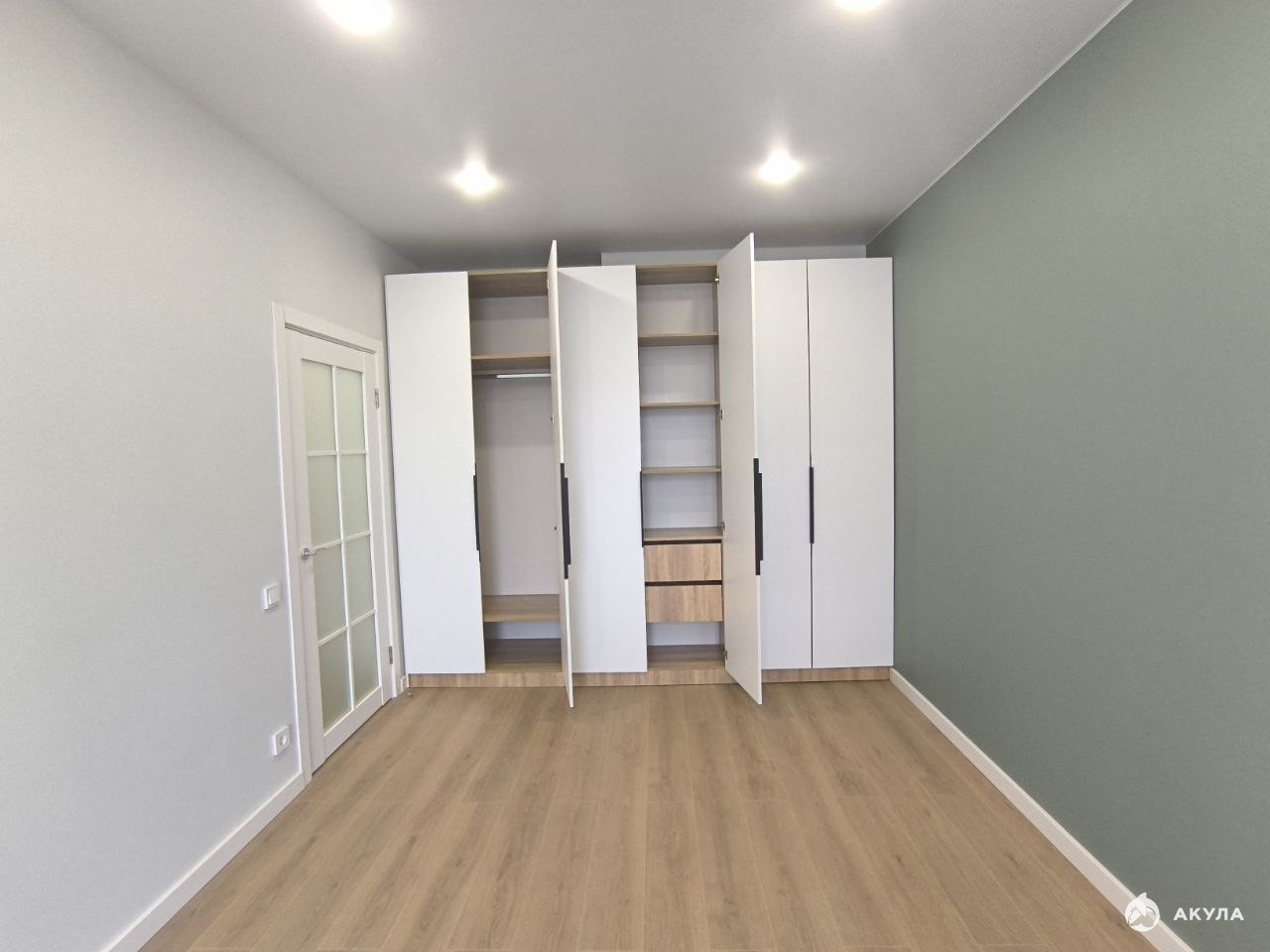 Входная дверь с зеркалом, ламинат 32 класса, натяжные потолки, обои в сдержанных тонах, межкомнатные двери, розетки, выключатели, точечные светильники, установлен кондиционер;