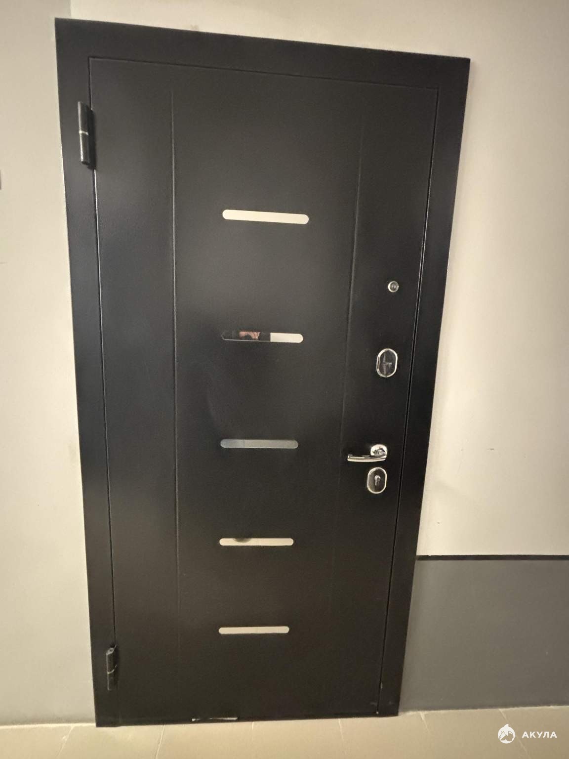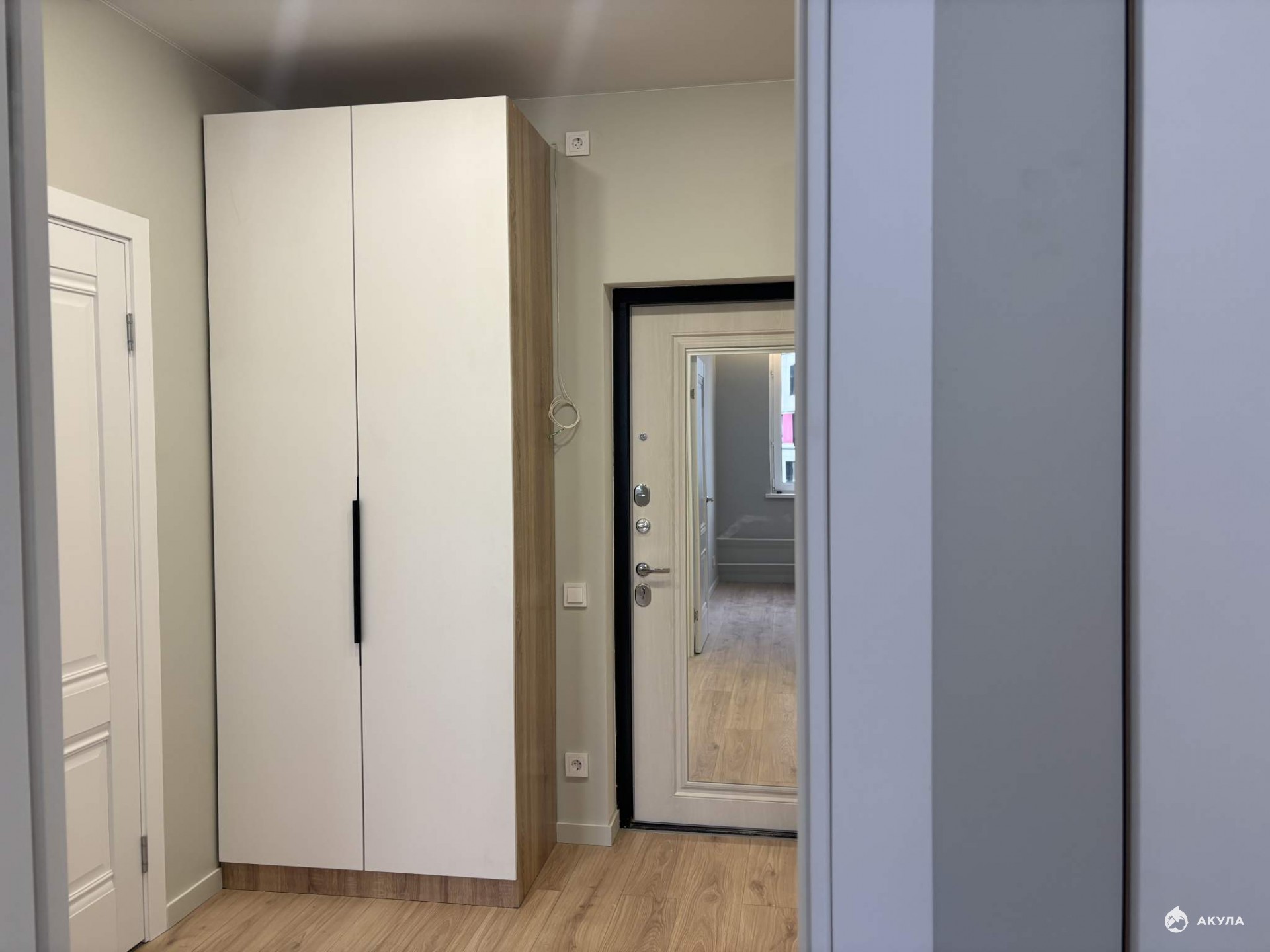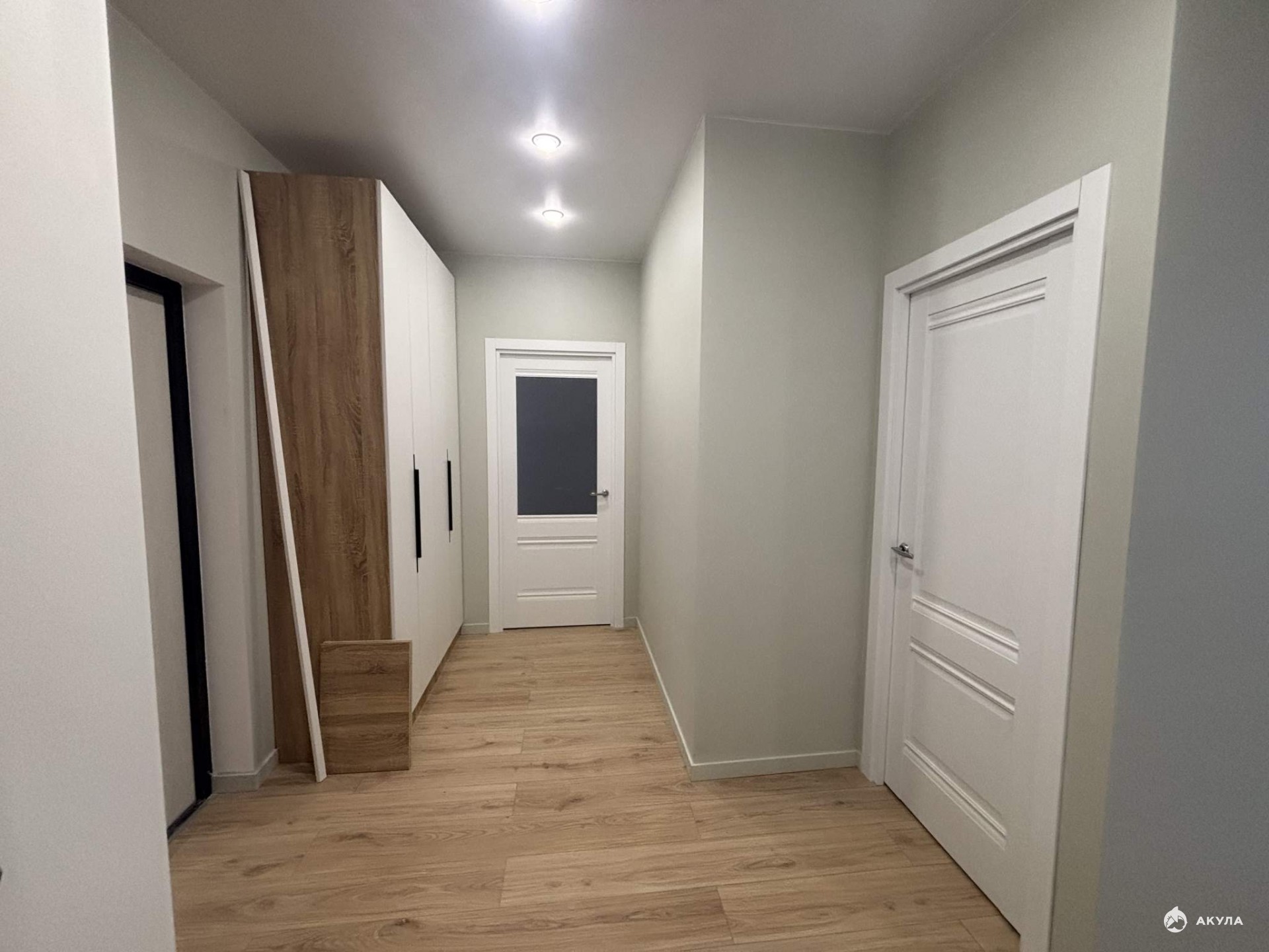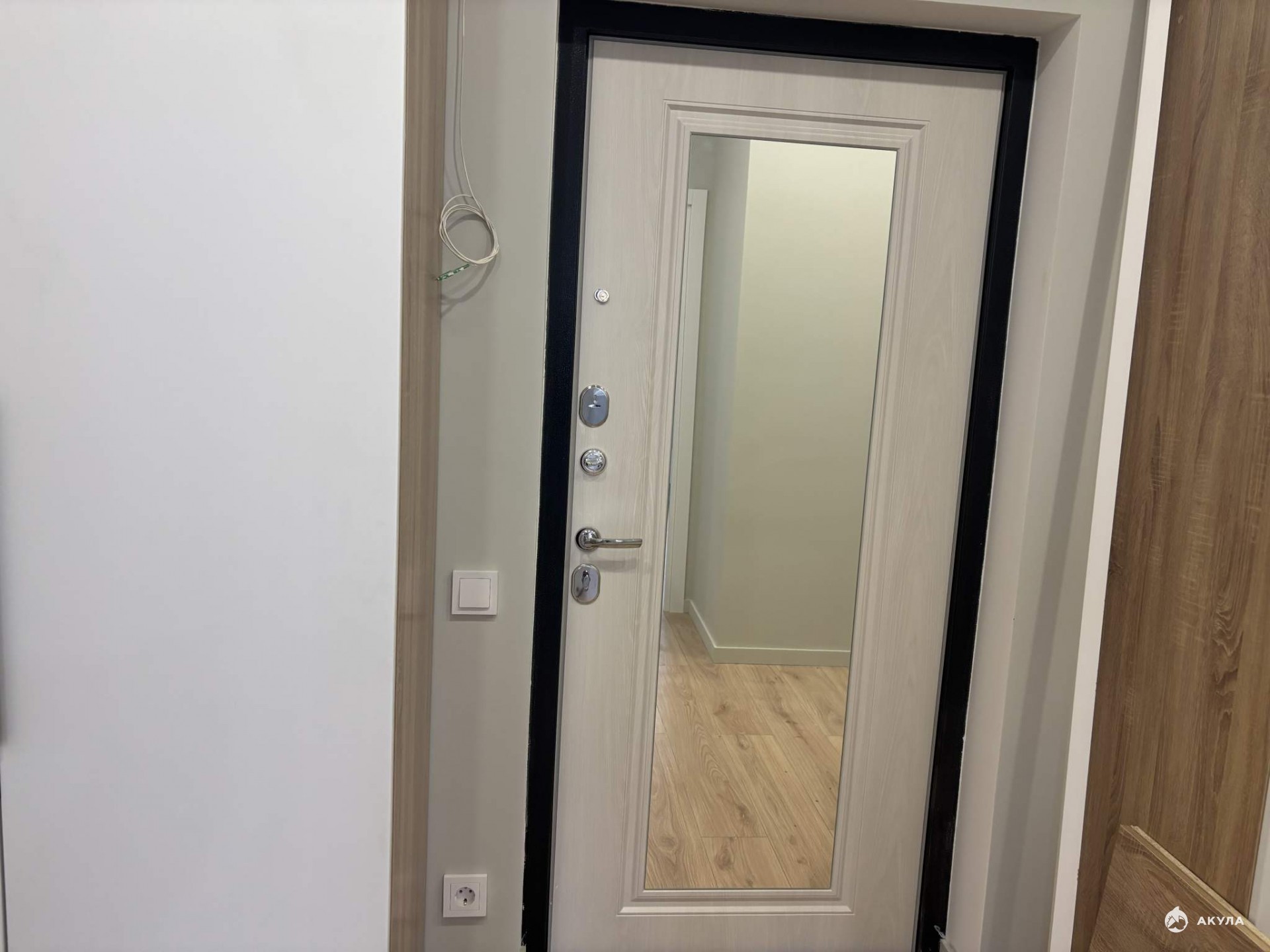 Входная дверь с зеркалом, ламинат 32 класса, натяжные потолки, обои в сдержанных тонах, межкомнатные двери, розетки, выключатели, точечные светильники, установлен кондиционер.