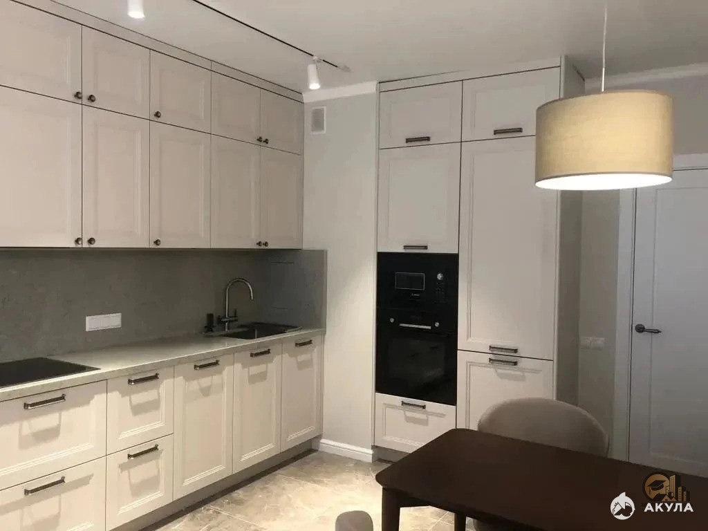 Просторная кухня-гостиная оснащена необходимой техникой для комфортной жизни: встроенный холодильник, духовой шкаф, посудомоечная машина, фильтр для воды, измельчитель пищевых отходов + обеденная группа и зона отдыха.