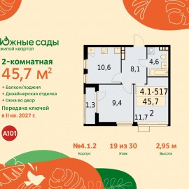 2-комн. квартира с отделкой в ЖК "Южные сады" на 17 этаже. Общая площадь: 45.7 кв.м., жилая: 21.1 кв.м., площадь просторной кухни-столовой: 10.6 кв.м. Квартира угловая, очень светлая, естественная вентиляция при открытии окон. В квартире одна лоджия, один совмещенный санузел. Высота...