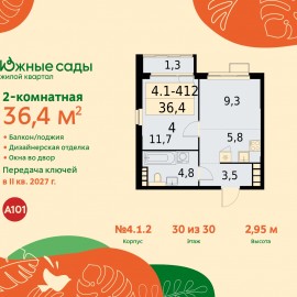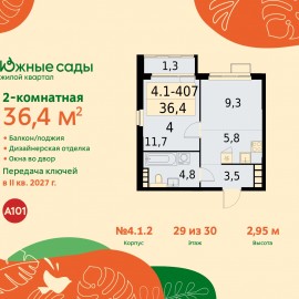 2-комн. квартира с европланировкой и отделкой в ЖК "Южные сады" на 30 этаже. Общая площадь: 36.4 кв.м., жилая: 20.8 кв.м., общая площадь гостиной-столовой с кухонной зоной: 15.1 кв.м. Европейская планировка, кухня-гостиная - идеальный вариант для тех, кто любит часто принимать гостей....