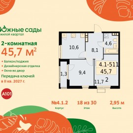 Двухкомнатная квартира от застройщика с отделкой в ЖК "Южные сады" на 18 этаже. Общая площадь: 45.7 кв.м., жилая: 21.1 кв.м., площадь просторной кухни-столовой: 10.6 кв.м. Квартира угловая, идеально подойдет любителям тишины и панорамных видов. В квартире одна лоджия, один совмещенный...