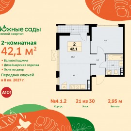2-комн. квартира с европланировкой и отделкой в ЖК "Южные сады" на 21 этаже. Общая площадь: 42.1 кв.м., жилая: 22.6 кв.м., общая площадь гостиной-столовой с кухонной зоной: 19.6 кв.м. Европланировка, зона гостиной комнаты объединена с кухней. Квартира угловая, очень светлая,...