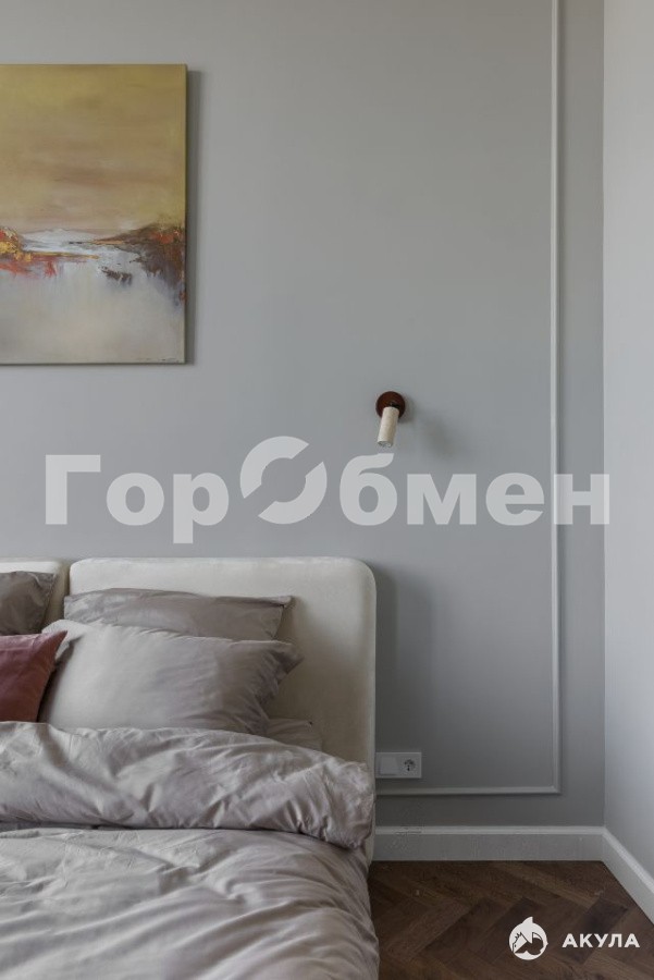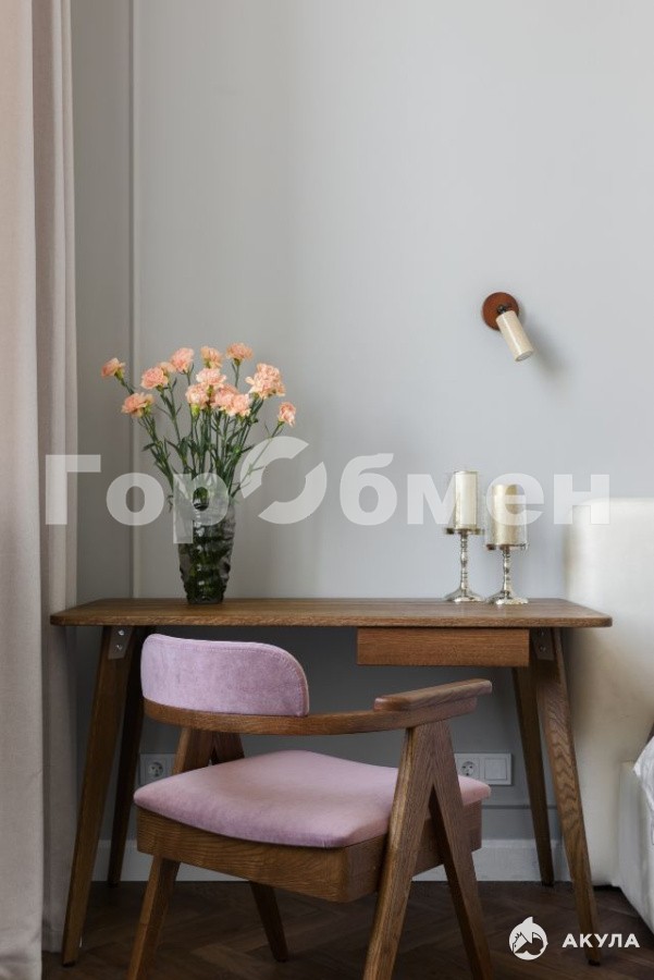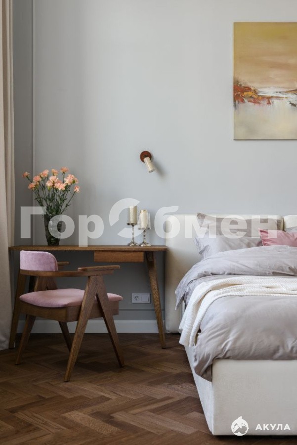 В спальне гардеробная с подсветкой, кровать с ортопедическим матрасом Askona, письменный стол и стул из массива дуба.