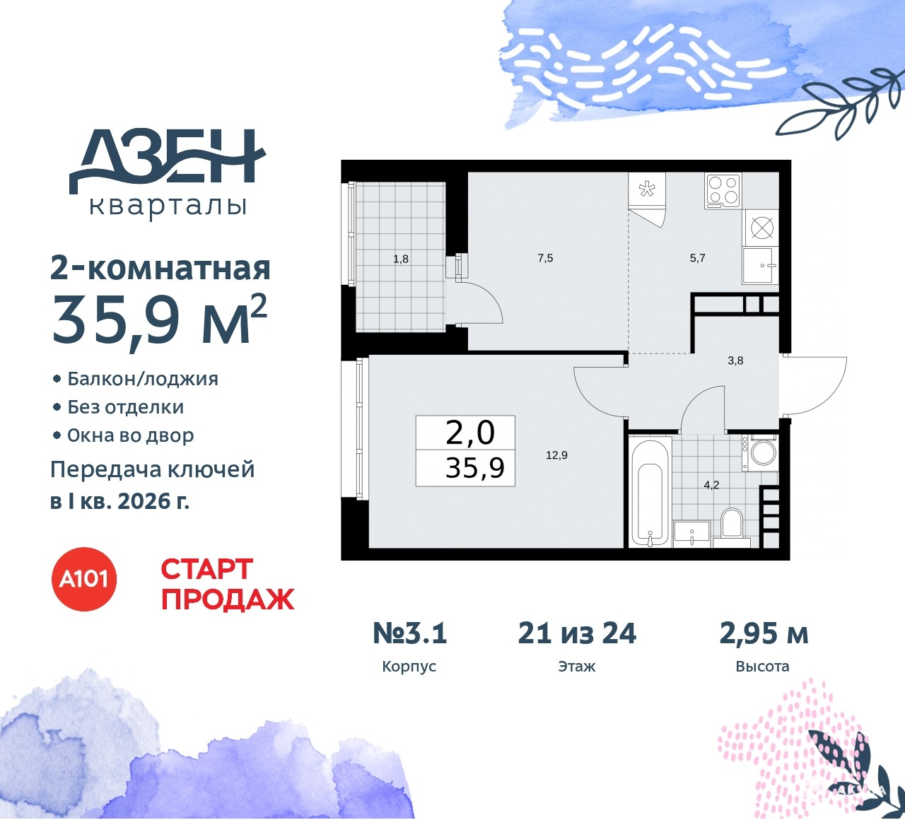 Просторная 2-комн. квартира с европланировкой в ЖК "Дзен-кварталы" на 21 этаже. Квартира без отделки, после получения ключей можно делать ремонт. Общая площадь: 35.9 кв.м., жилая: 20.4 кв.м., суммарная площадь гостиной-столовой с кухонной зоной: 13.2 кв.м. Европейская планировка, в просторной кухне-гостиной удобно как готовить, так и отдыхать. Комнаты изолированные, все окна выходят на одну сторону. В квартире одна лоджия, один совмещенный санузел. Высота потолков 2.95 м.