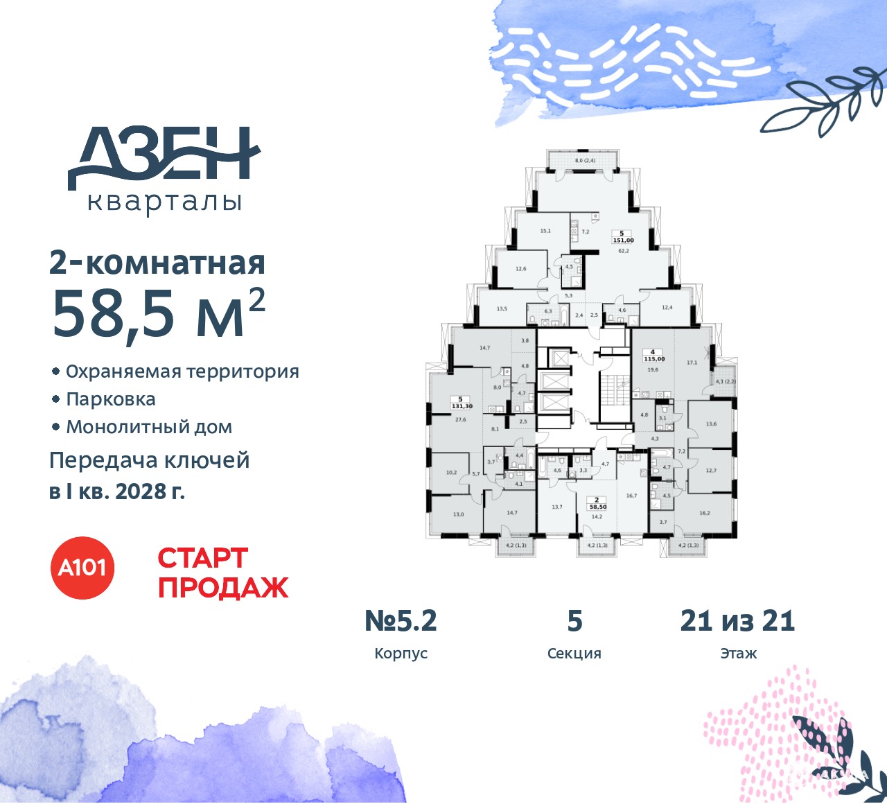 Просторная двухкомнатная квартира бизнес-класса с европланировкой в ЖК "Дзен-кварталы" на 21 этаже. Квартира без отделки, полностью готова к ремонту. Общая площадь: 58.5 кв.м., жилая: 27.9 кв.м., общая площадь гостиной-столовой с кухонной зоной: 30.9 кв.м. Европейская планировка, за счет большой площади кухни-гостиной квартира выглядит просторной и очень удобна для жизни. Комнаты изолированные, все окна выходят на одну сторону. В квартире один балкон, один совмещенный и один раздельный санузел. Высота потолков 3.1 м.