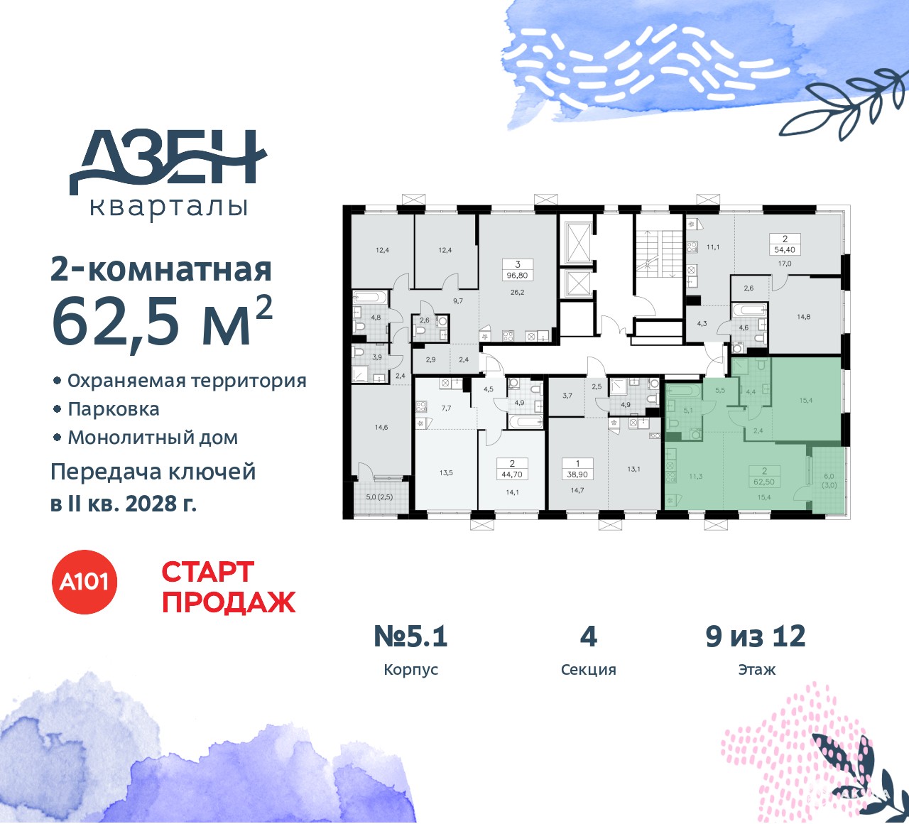 Дом монолитный, черырехподъездный, переменной этажности, от 8 до 12 этажей. Квартира находится в 4-й секции высотой 12 этажей в корпусе бизнес-класса 5.1. На этаже 5 квартир. В подъезде 1 пассажирский и 1 грузовой лифт. Начало строительства - 3 квартал 2025 года. Окончание строительства - 2 квартал 2028 года. Оформление сделки по договору долевого участия.