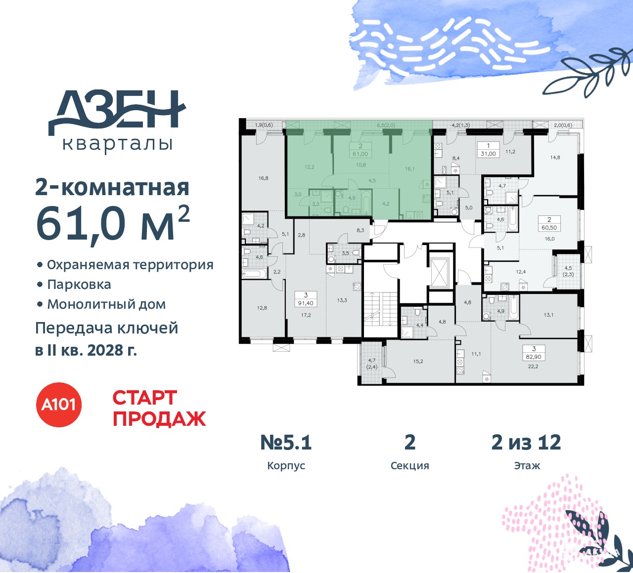 Продается 2-комн. квартира бизнес-класса с отделкой в ЖК "Дзен-кварталы" на 2 этаже. Общая площадь: 61 кв.м., жилая: 23 кв.м., площадь просторной кухни-столовой: 16.1 кв.м. Комнаты изолированные, все окна выходят на одну сторону. В квартире один балкон, два совмещенных санузла. Высота потолков 3.1 м.