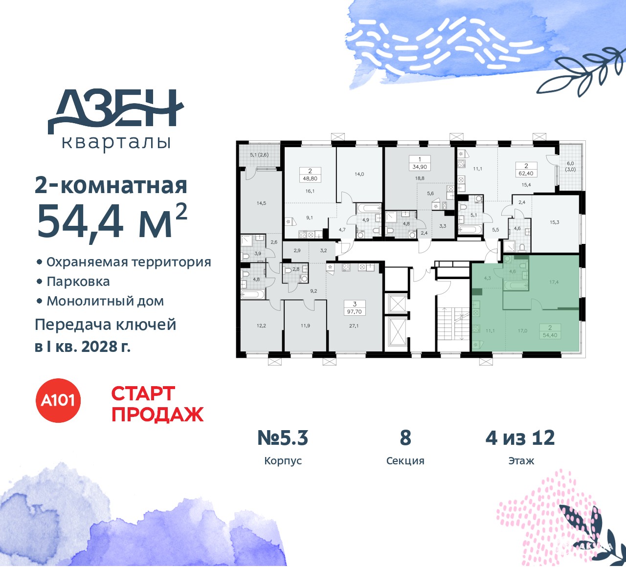 Просторная 2-комн. квартира бизнес-класса с европланировкой в ЖК "Дзен-кварталы" на 4 этаже. Квартира без отделки, после оформления собственности можно делать ремонт. Общая площадь: 54.4 кв.м., жилая: 31.8 кв.м., суммарная площадь гостиной-столовой с кухонной зоной: 28.1 кв.м. Европейская планировка, кухня и гостиная объединены в одно просторное помещение. Квартира угловая, идеально подойдет любителям тишины и панорамных видов. В квартире один совмещенный санузел. Высота потолков 3.1 м.