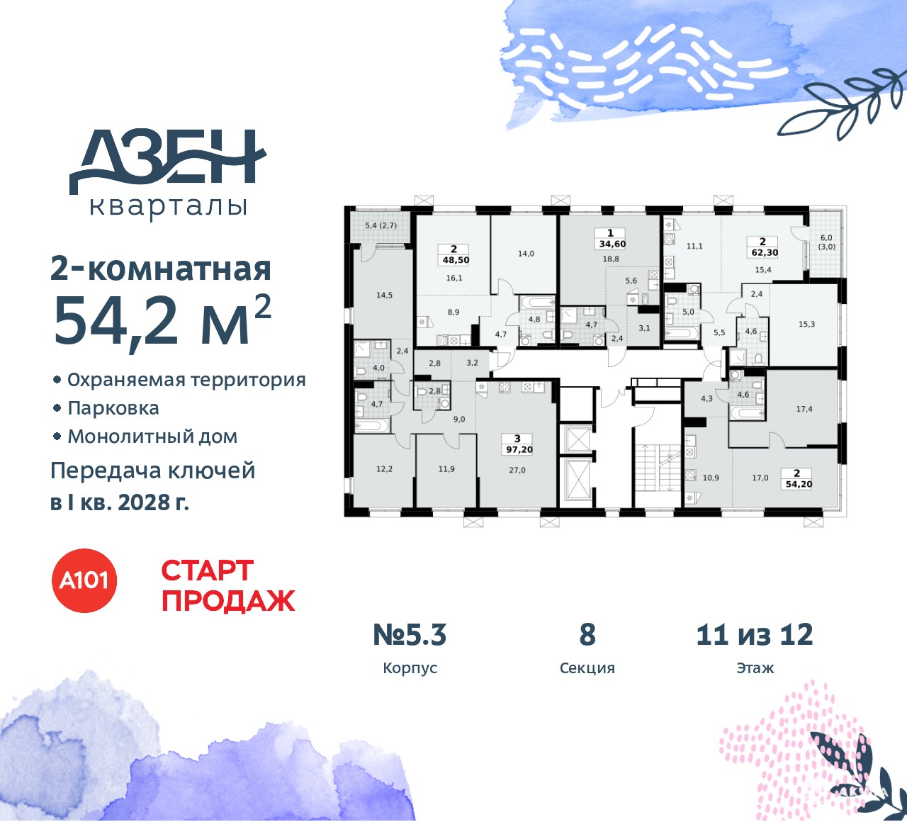 2-комн. квартира бизнес-класса с европланировкой от застройщика в ЖК "Дзен-кварталы" на 11 этаже. Квартира без отделки, новый владелец может сделать ремонт по индивидуальному дизайн-проекту. Общая площадь: 54.2 кв.м., жилая: 31.8 кв.м., суммарная площадь гостиной-столовой с кухонной зоной: 27.9 кв.м. Европейская планировка, за счет большой площади кухни-гостиной квартира выглядит просторной и очень удобна для жизни. Угловая квартира, идеально подойдет любителям тишины и панорамных видов. В квартире один совмещенный санузел. Высота потолков 3.1 м.