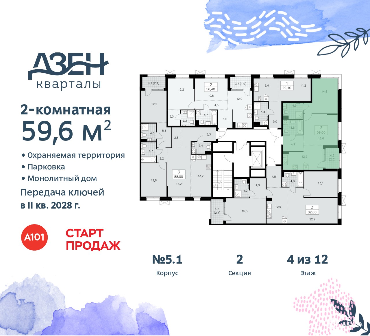 Дом монолитный, черырехподъездный, переменной этажности, от 8 до 12 этажей. Квартира находится во 2-й секции высотой 8 этажей в корпусе бизнес-класса 5.1. На этаже 5 квартир. В подъезде 1 грузовой лифт. Начало строительства - 3 квартал 2025 года. Окончание строительства - 2 квартал 2028 года. Оформление сделки по договору долевого участия.
