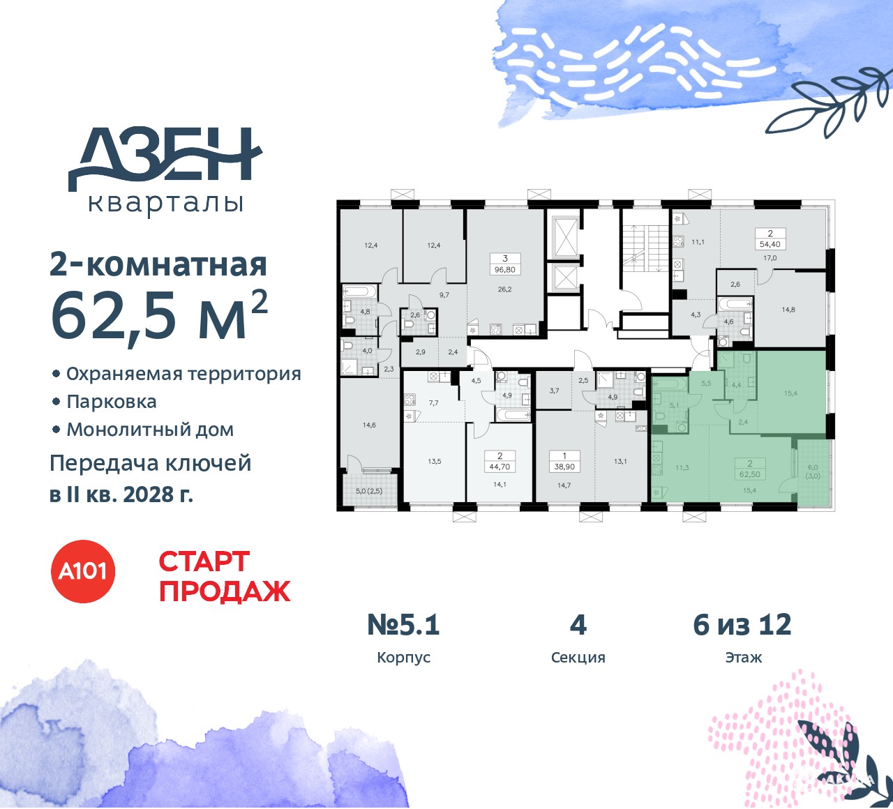 Дом монолитный, черырехподъездный, переменной этажности, от 8 до 12 этажей. Квартира находится в 4-й секции высотой 12 этажей в корпусе бизнес-класса 5.1. На этаже 5 квартир. В подъезде 1 пассажирский и 1 грузовой лифт. Начало строительства - 3 квартал 2025 года. Окончание строительства - 2 квартал 2028 года. Оформление сделки по договору долевого участия.