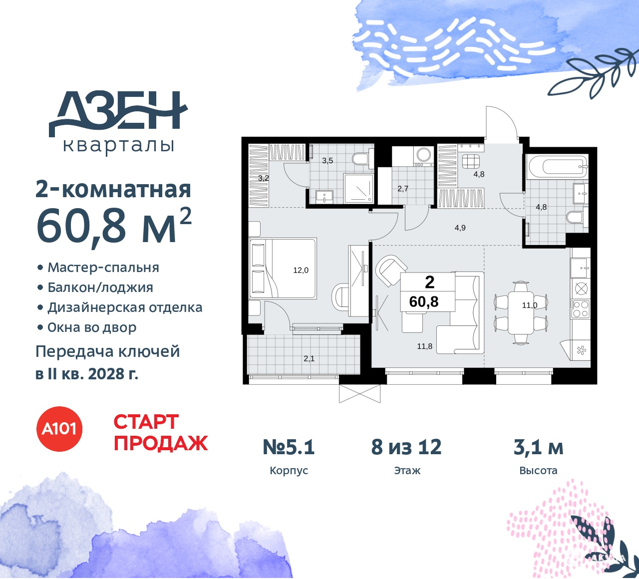 2-комн. квартира бизнес-класса с европланировкой и отделкой в ЖК "Дзен-кварталы" на 8 этаже. Общая площадь: 60.8 кв.м., жилая: 23.8 кв.м., суммарная площадь гостиной-столовой с кухонной зоной: 22.8 кв.м. Европейская планировка, кухня и гостиная объединены в одно просторное помещение. Комнаты изолированные, все окна выходят на одну сторону. В квартире одна лоджия, два совмещенных санузла. Высота потолков 3.1 м.