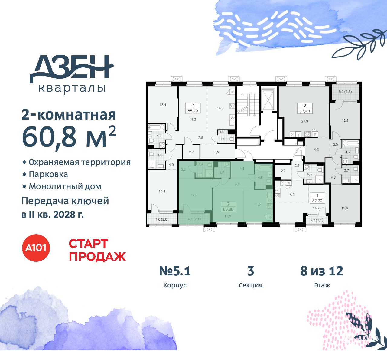 Дом монолитный, черырехподъездный, переменной этажности, от 8 до 12 этажей. Квартира находится в 3-й секции высотой 8 этажей в корпусе бизнес-класса 5.1. На этаже 4 квартиры. В подъезде 1 грузовой лифт. Начало строительства - 3 квартал 2025 года. Окончание строительства - 2 квартал 2028 года. Оформление сделки по договору долевого участия.