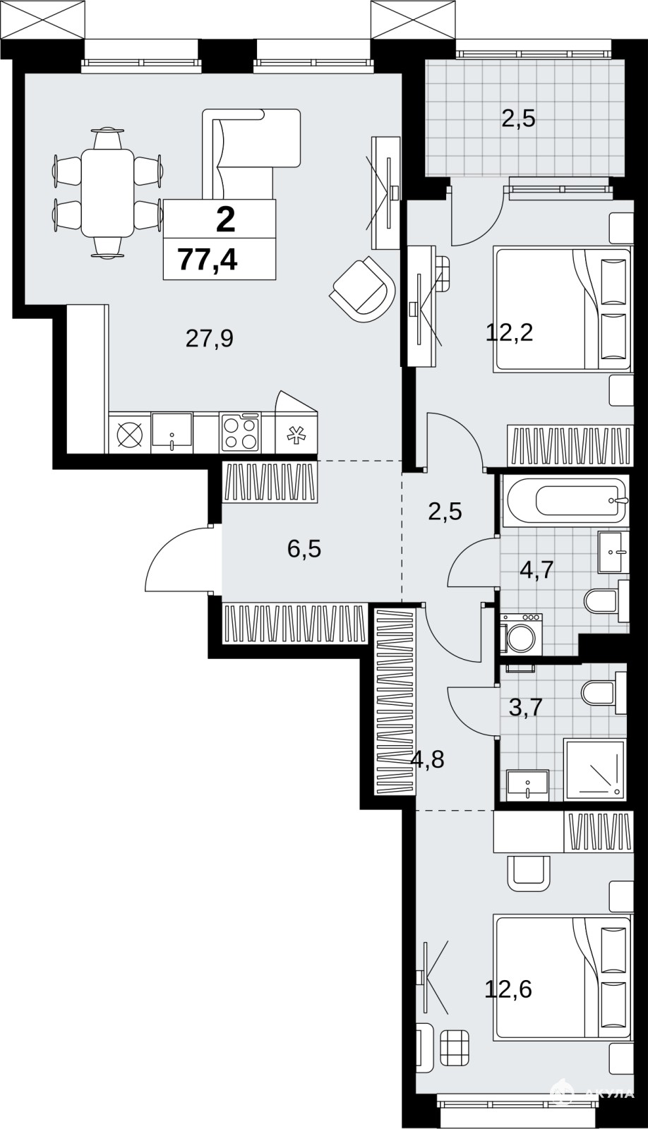 Продается двухкомнатная квартира от застройщика с отделкой в ЖК "Дзен-кварталы" на 4 этаже. Общая площадь: 77.4 кв.м., жилая: 24.8 кв.м., площадь просторной кухни-столовой: 27.9 кв.м. Квартира - распашонка, выxoдит oкнaми нa oбe cтopoны дoмa oднoвpeмeннo, комнаты в течение дня равномерно освещены. В квартире одна лоджия, два совмещенных санузла. Высота потолков 3.1 м.