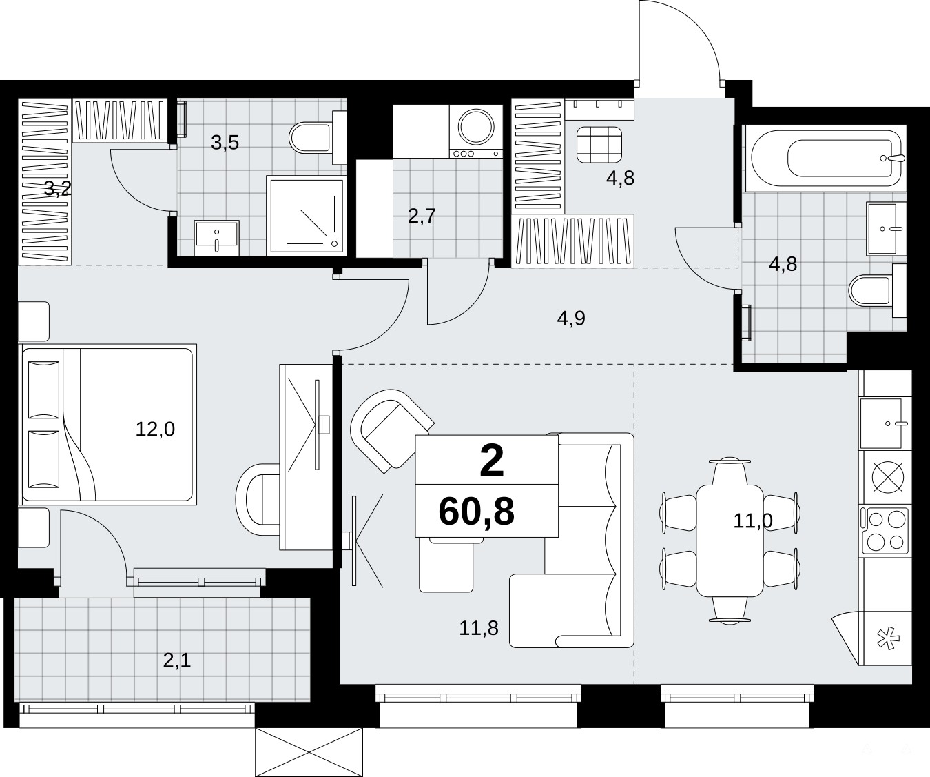 2-комн. квартира с европланировкой и отделкой в ЖК "Дзен-кварталы" на 4 этаже. Общая площадь: 60.8 кв.м., жилая: 23.8 кв.м., общая площадь гостиной-столовой с кухонной зоной: 22.8 кв.м. Европланировка, кухня-гостиная - идеальный вариант для тех, кто любит часто принимать гостей. Комнаты изолированные, все окна выходят на одну сторону. В квартире одна лоджия, два совмещенных санузла. Высота потолков 3.1 м.