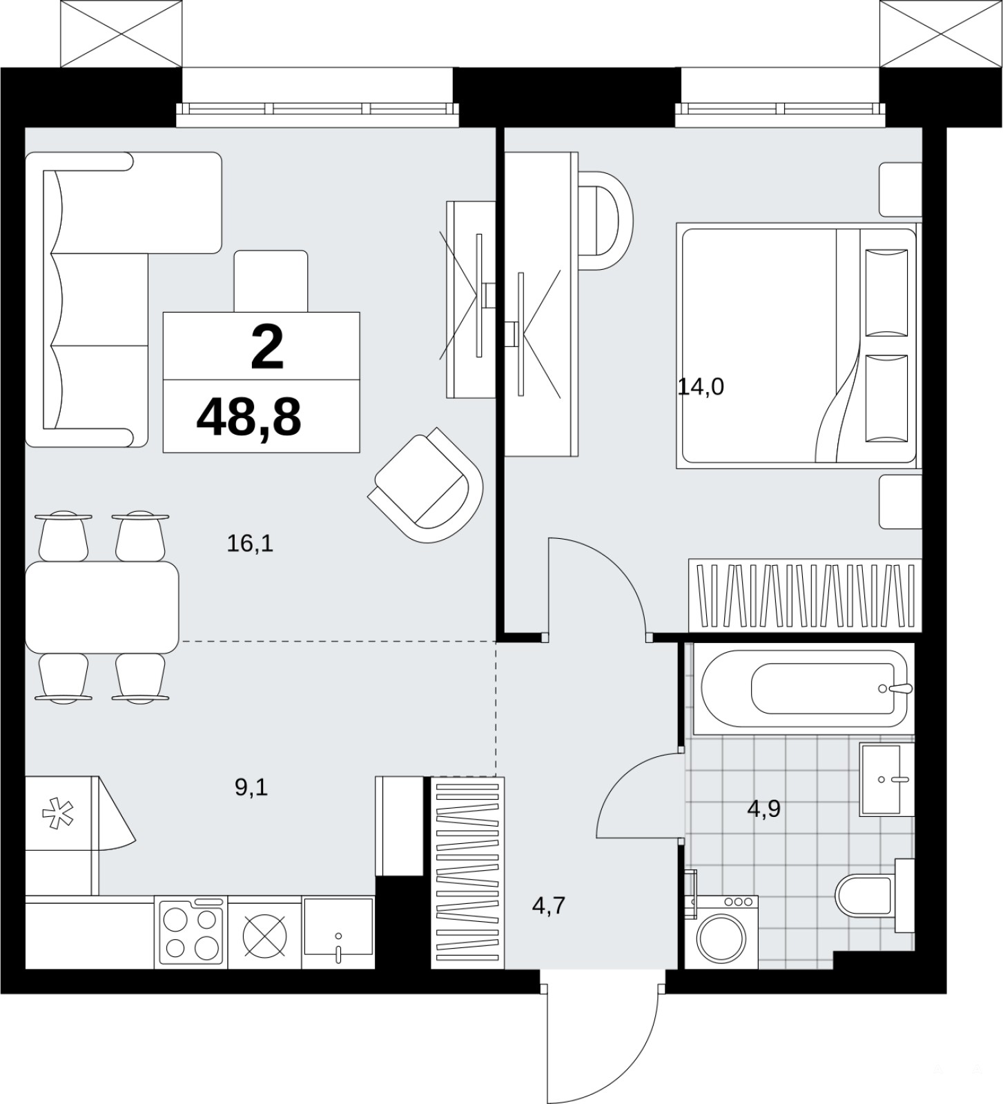 Двухкомнатная квартира с европланировкой в ЖК "Дзен-кварталы" на 7 этаже. Квартира без отделки, новый собственник может сделать ремонт по индивидуальному дизайн-проекту. Общая площадь: 48.8 кв.м., жилая: 30.1 кв.м., общая площадь гостиной-столовой с кухонной зоной: 25.2 кв.м. Европланировка, кухня-гостиная - идеальный вариант для тех, кто любит часто принимать гостей. Комнаты изолированные, все окна выходят на одну сторону. В квартире один совмещенный санузел. Высота потолков 3.1 м.