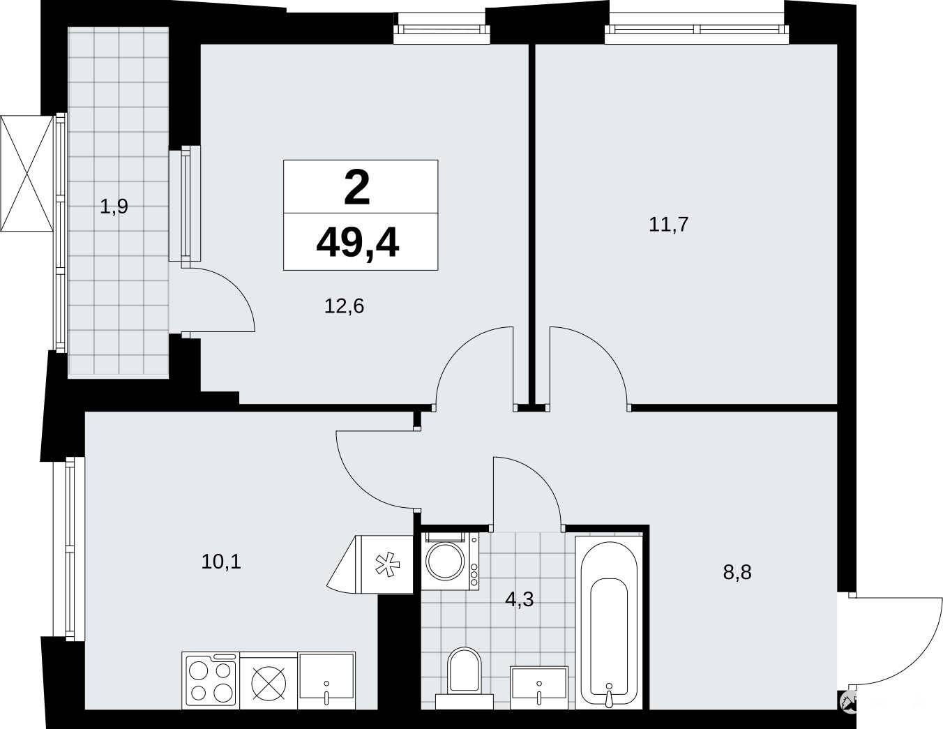 Двухкомнатная квартира в ЖК "Дзен-кварталы" на 16 этаже. Квартира без отделки, после выдачи ключей можно делать ремонт. Общая площадь: 49.4 кв.м., жилая: 24.3 кв.м., площадь просторной кухни-столовой: 10.1 кв.м. Квартира угловая, идеально подойдет любителям тишины и панорамных видов. В квартире одна лоджия, один совмещенный санузел. Высота потолков 2.8 м.