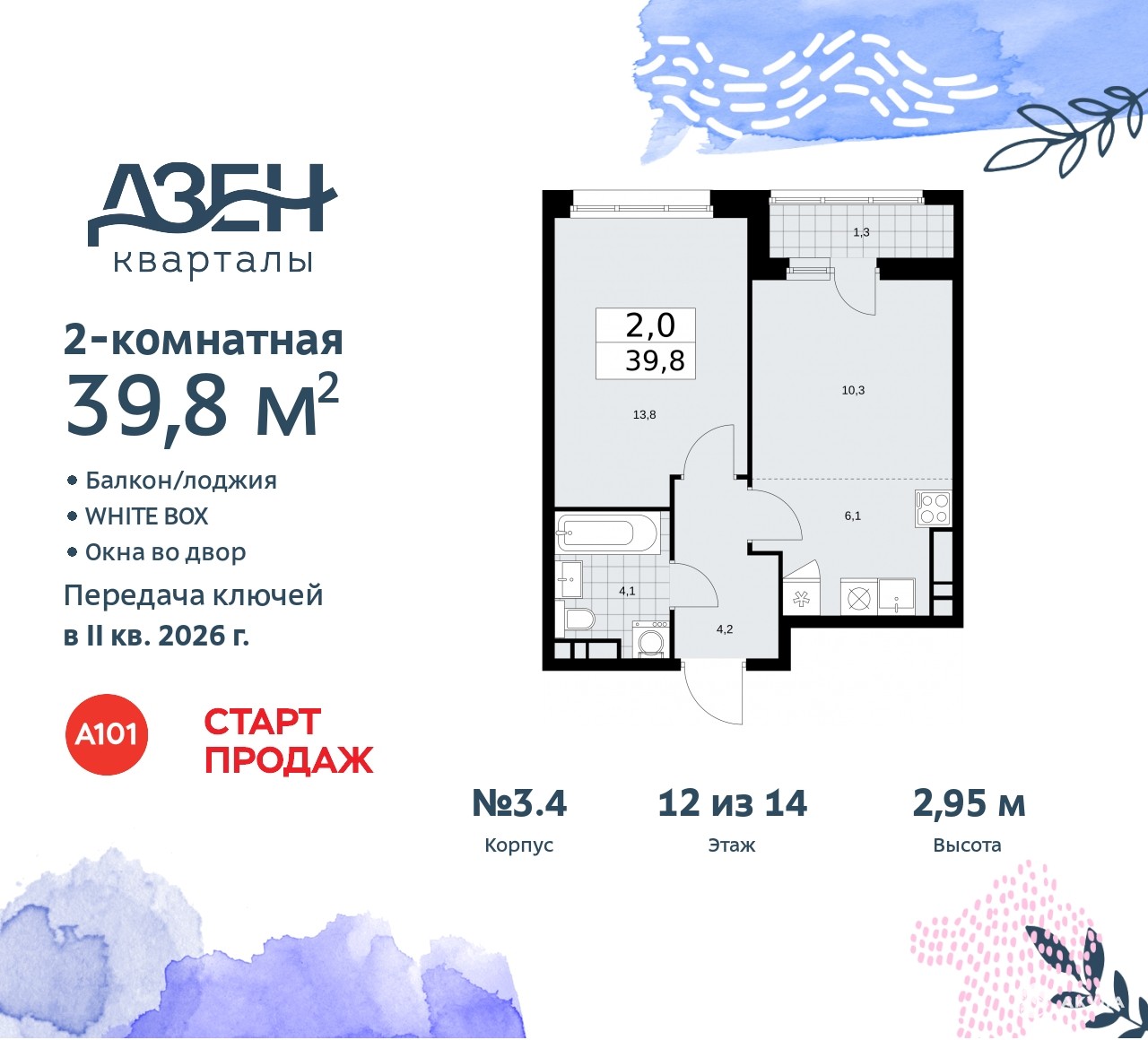 2-комн. квартира с европланировкой и предчистовой отделкой в ЖК "Дзен-кварталы" на 12 этаже. Общая площадь: 39.8 кв.м., жилая: 24.1 кв.м., суммарная площадь гостиной-столовой с кухонной зоной: 16.4 кв.м. Европейская планировка, кухня-гостиная - идеальный вариант для тех, кто любит часто принимать гостей. Комнаты изолированные, все окна выходят на одну сторону. В квартире одна лоджия, один совмещенный санузел. Высота потолков 2.95 м.