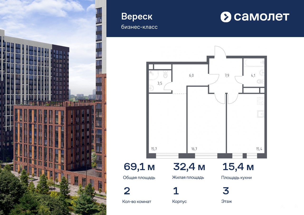 Предлагается 2-комнатная квартира бизнес-класса 69, 1 кв.м в корпусе 1 на 3 этаже, в ЖК «Вереск»