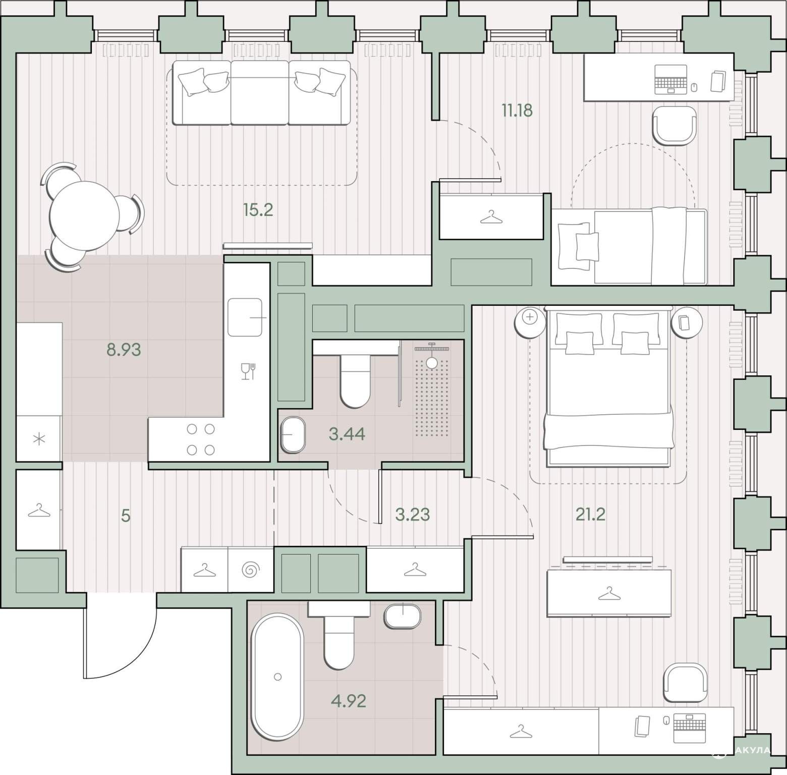 Жилая площадь 32.38 м2, кухня 8.93 м2, предчистовая отделка, комнаты изолированные.