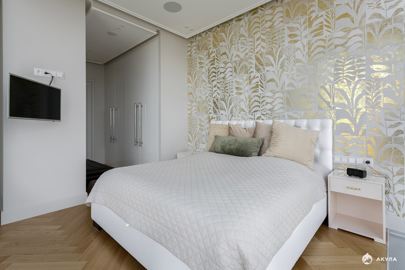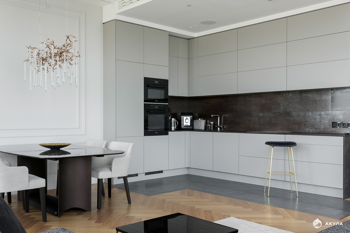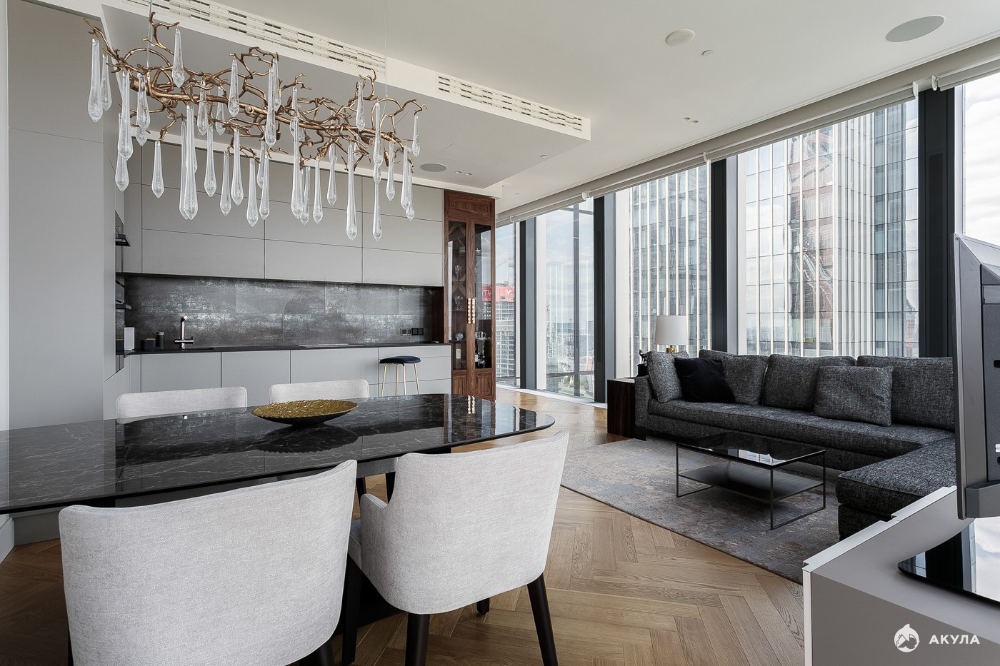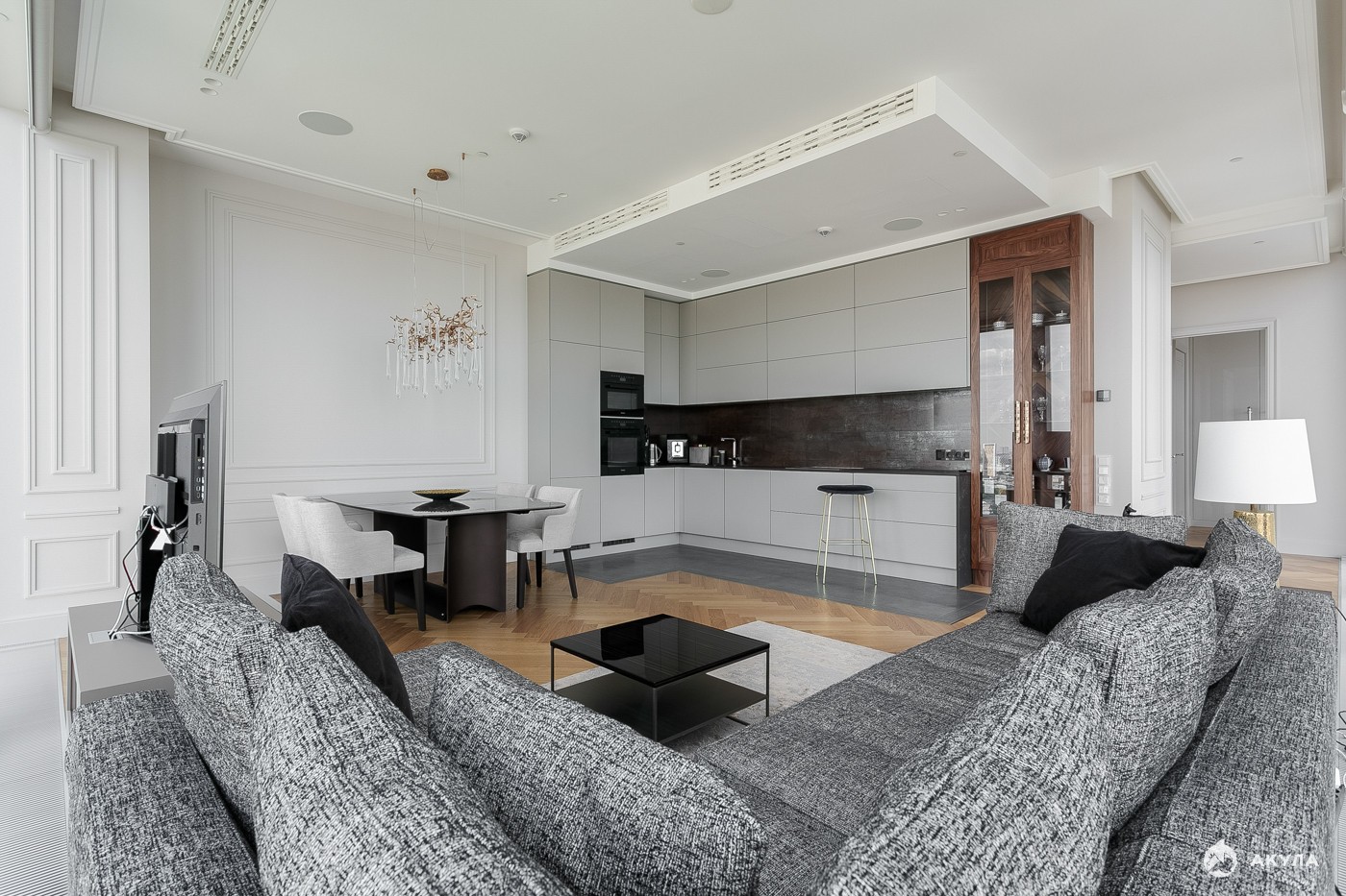 Премиальная отделка в современном стиле с натуральным паркетом и исключительно импортными материалами: плитка Versace, итальянская и немецкая сантехника, электрооборудование ABB и Gira, встроенная 6-зонная аудиосистема VSSL под Airplay с индивидуальным управлением в каждой комнате и с/у, кухня Leicht (шкафы с электроприводом и push-to-open), кухонная и бытовая техника Miele и Gaggenau.