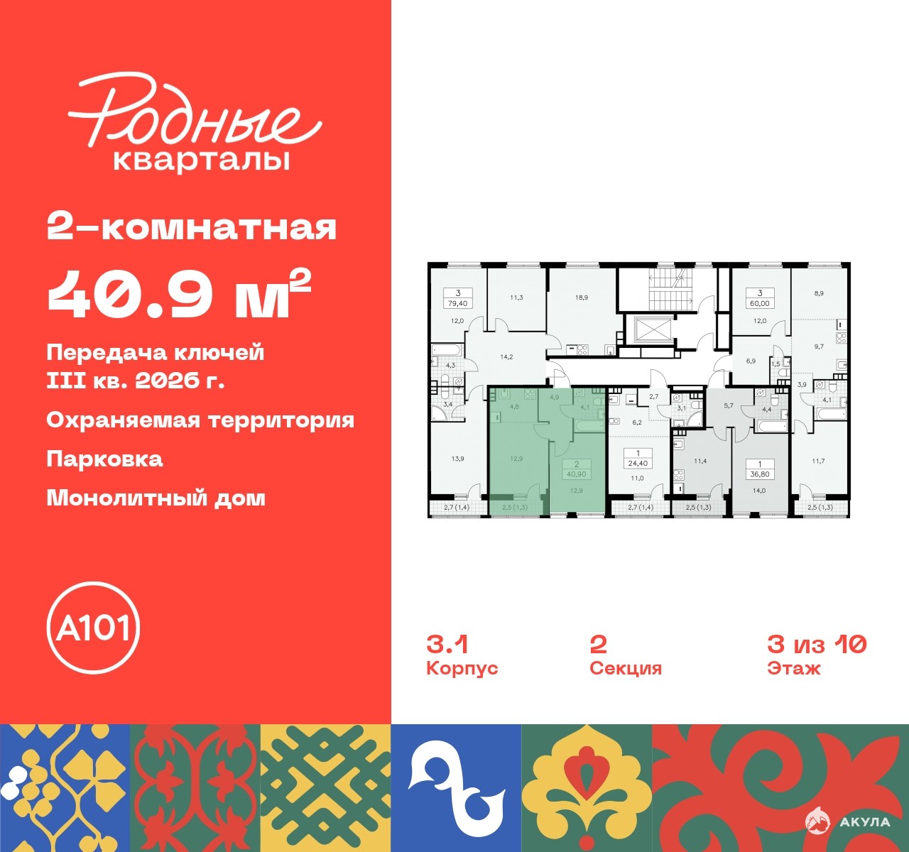 Дом монолитный, черырехподъездный, высотой 10 этажей. Квартира находится во 2-й секции в корпусе 3.1. На этаже 5 квартир. В подъезде 1 грузовой лифт. Начало строительства - 2 квартал 2024 года. Окончание строительства - 3 квартал 2026 года. Оформление сделки по договору долевого участия.
