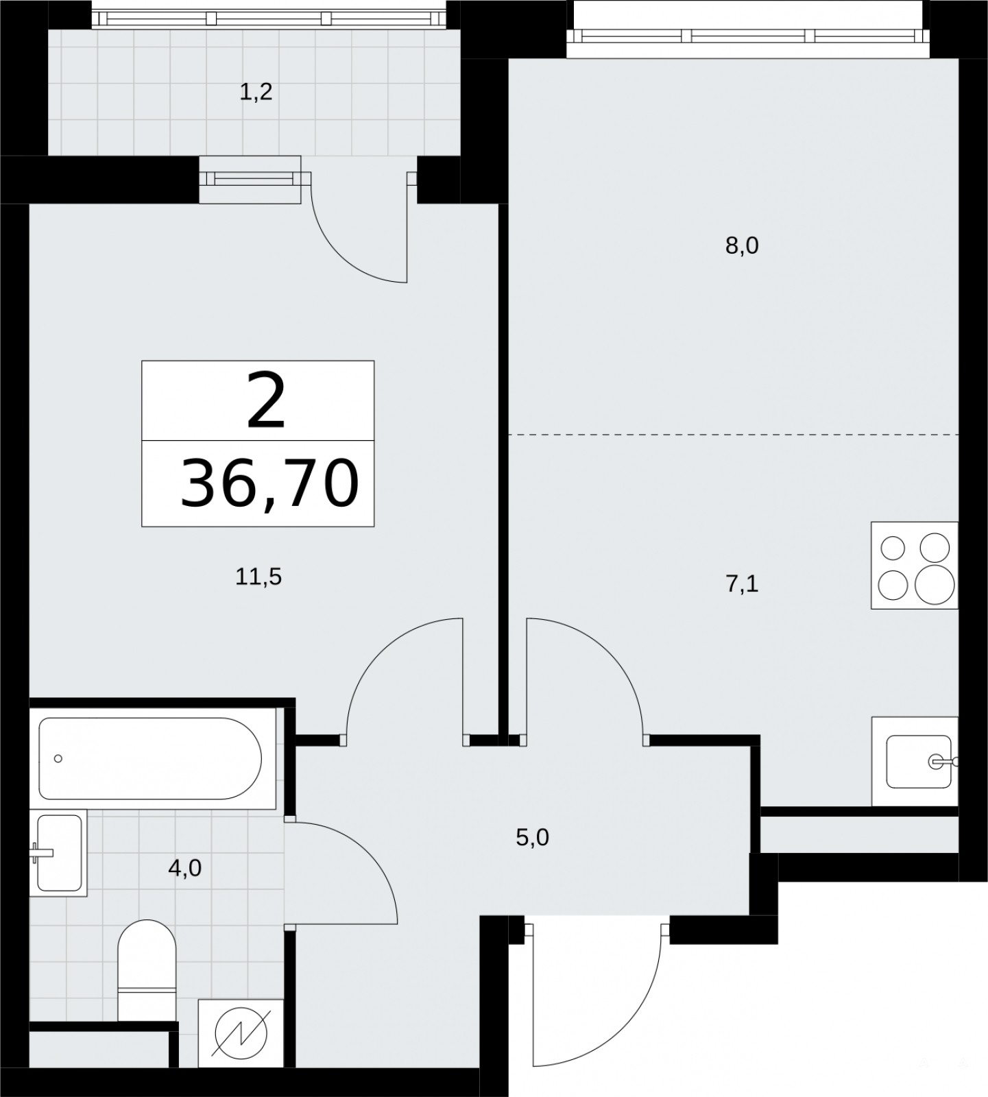 Продается 2-комн. квартира с европланировкой и отделкой в ЖК "Родные кварталы" на 8 этаже. Общая площадь: 36.8 кв.м., жилая: 19.5 кв.м., общая площадь гостиной-столовой с кухонной зоной: 15.1 кв.м. Европланировка, кухня и гостиная объединены в одно просторное помещение. Комнаты изолированные, все окна выходят на одну сторону. В квартире одна лоджия, один совмещенный санузел. Высота потолков 2.9 м.