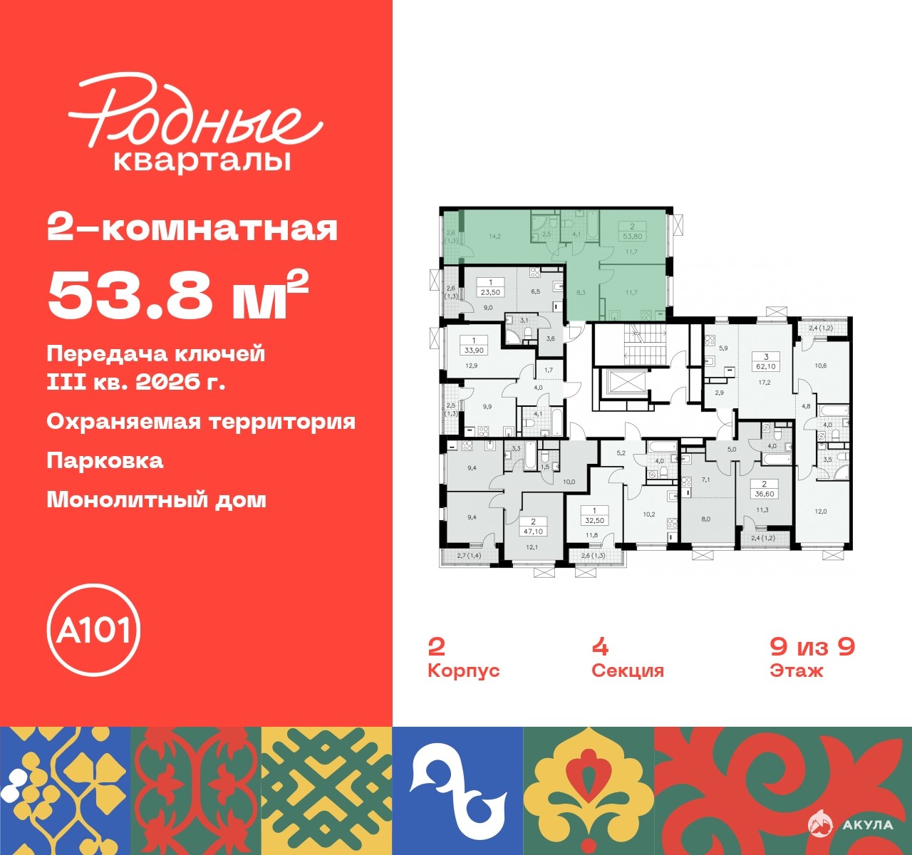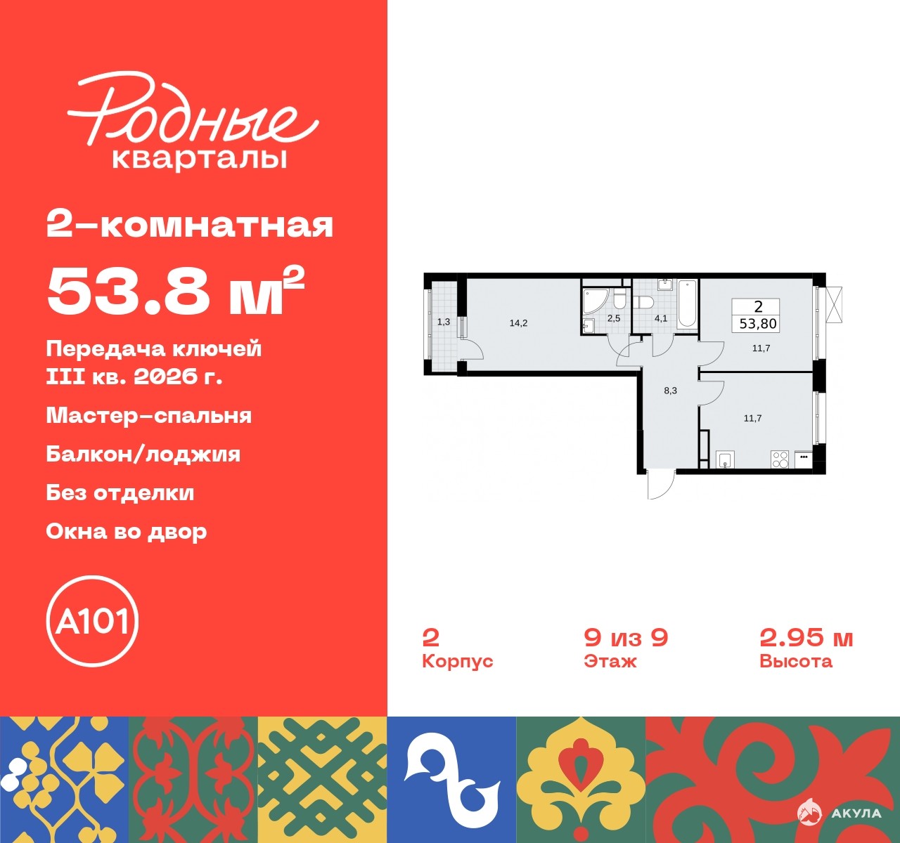 2-комн. квартира от застройщика в ЖК "Родные кварталы" на 9 этаже. Квартира без отделки, полностью готова к ремонту. Общая площадь: 53.8 кв.м., жилая: 25.9 кв.м., площадь просторной кухни-столовой: 11.7 кв.м. Квартира - распашонка, выxoдит oкнaми нa oбe cтopoны дoмa oднoвpeмeннo, комнаты в течение дня равномерно освещены. В квартире один балкон, два совмещенных санузла. Высота потолков 2.9 м.