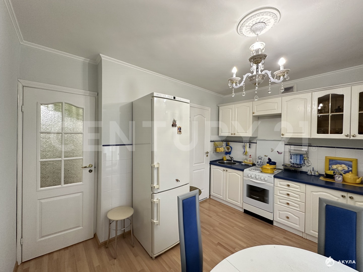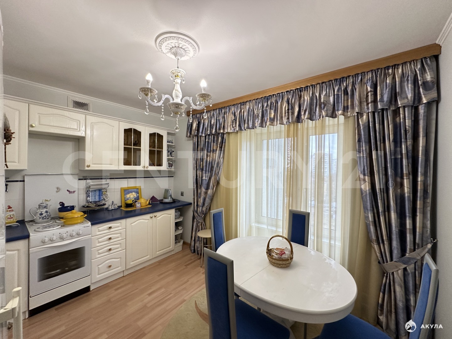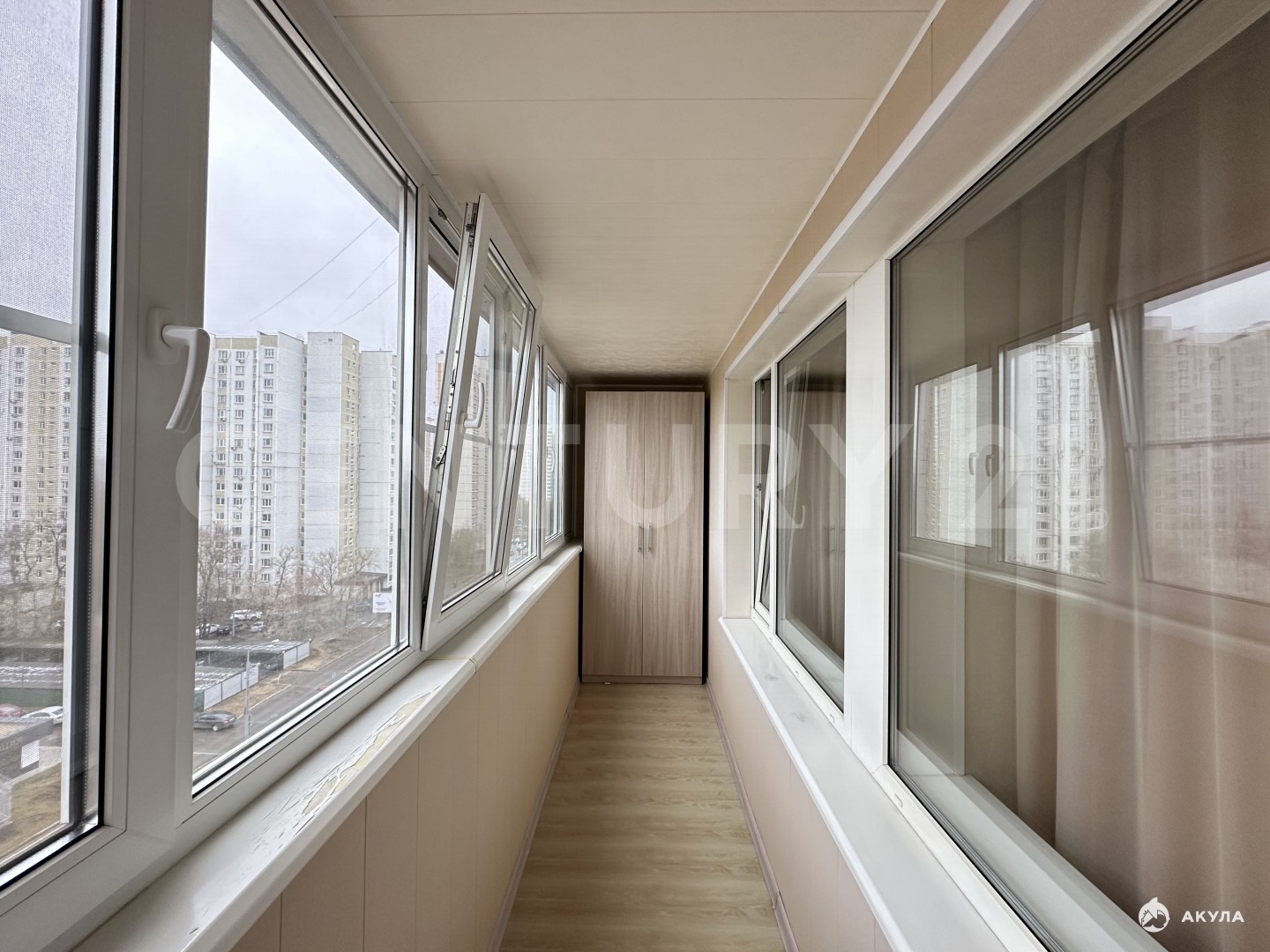 Большая застеклённая лоджия, на кухне есть кладовая.