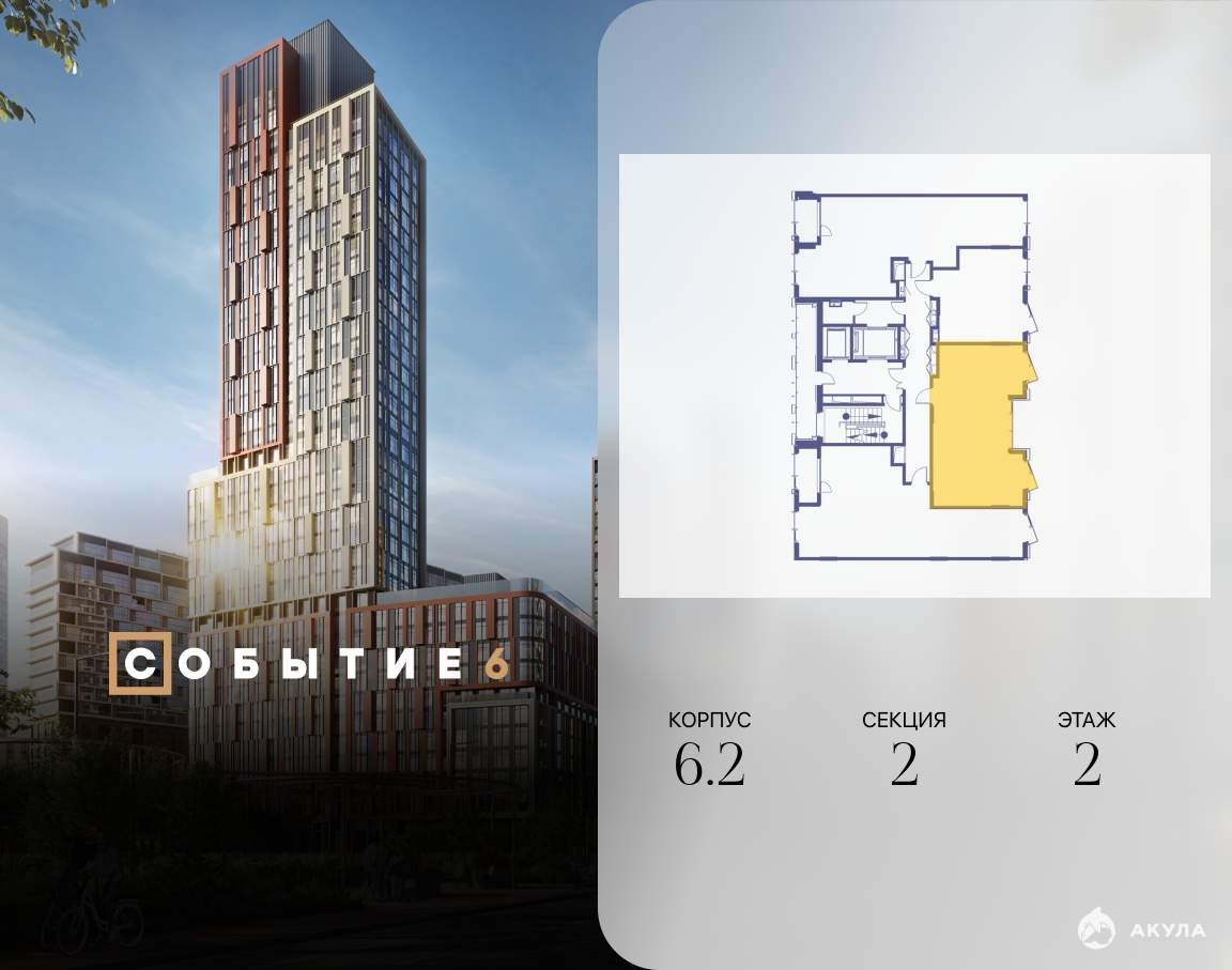 Продаётся 2-комнатная квартира от застройщика: общая площадь 59.80 м, жилая 30.10 м, кухня 18.40 м, 2-й этаж, жилой квартал «Событие-6», корпус 2 (секция 2) Срок сдачи: 1 квартал 2029 года.