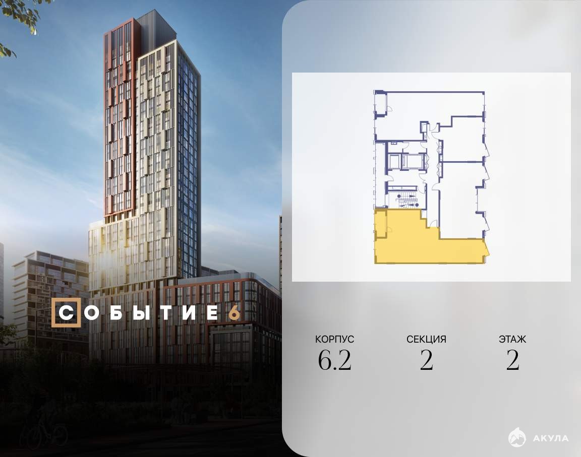 Продаётся 2-комнатная квартира от застройщика: общая площадь 74.60 м, жилая 33.00 м, кухня 18.30 м, 2-й этаж, жилой квартал «Событие-6», корпус 2 (секция 2) Срок сдачи: 1 квартал 2029 года.