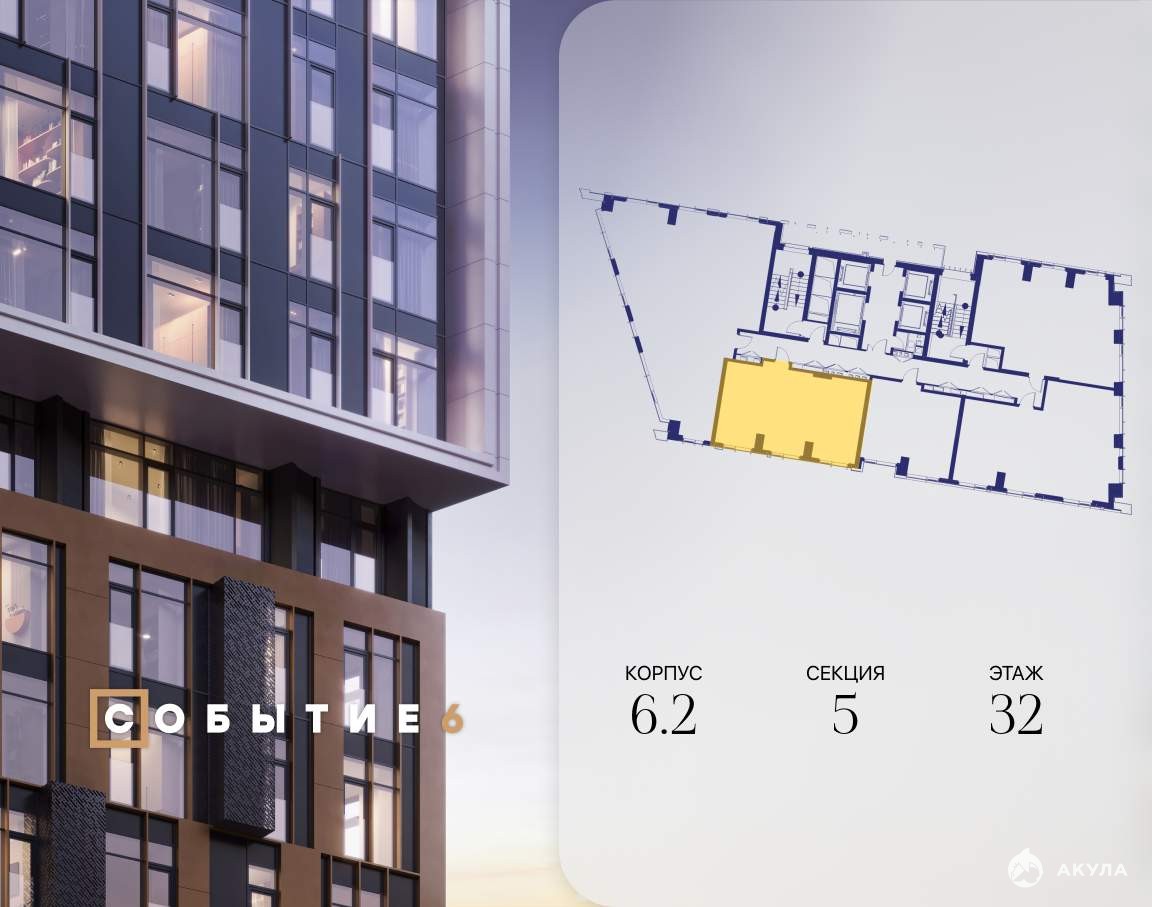 Продаётся 2-комнатная квартира от застройщика: общая площадь 61.80 м, жилая 32.90 м, кухня 17.80 м, 32-й этаж, жилой квартал «Событие-6», корпус 2 (секция 5) Срок сдачи: 4 квартал 2029 года.