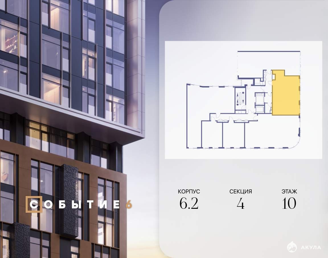 Продаётся 2-комнатная квартира от застройщика: общая площадь 64.10 м, жилая 27.60 м, кухня 21.50 м, 10-й этаж, жилой квартал «Событие-6», корпус 2 (секция 4) Срок сдачи: 4 квартал 2029 года.
