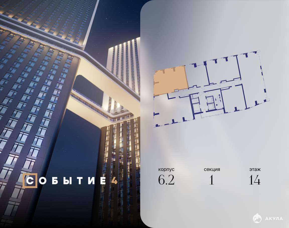 Продаётся 2-комнатная квартира от застройщика: общая площадь 74.50 м, жилая 28.40 м, кухня 26.20 м, 14-й этаж, жилой квартал «Событие-6», корпус 2 (секция 1) Срок сдачи: 1 квартал 2029 года.