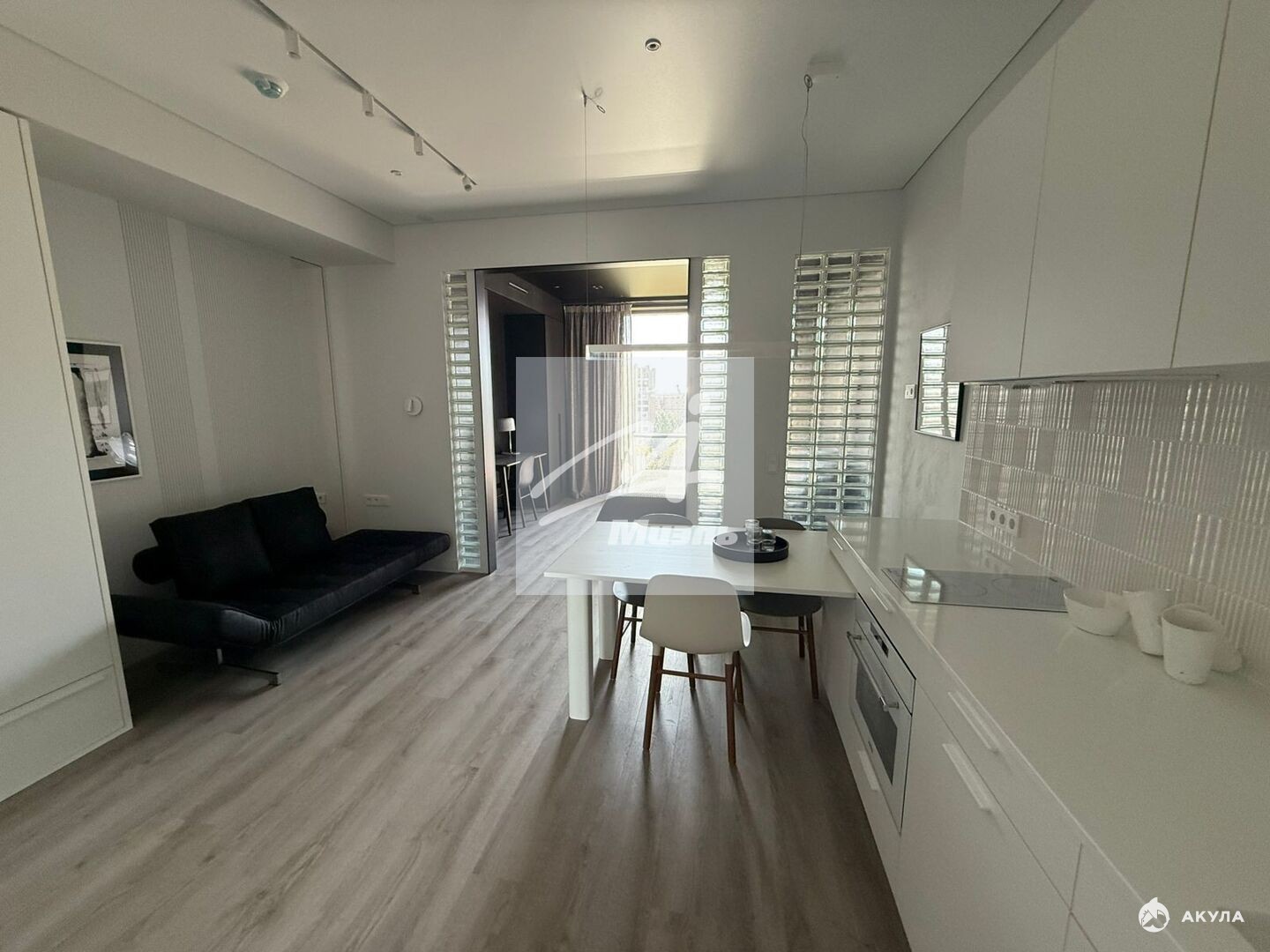 светлая квартира состоит из двух частей общей площадью 73, 4 м² и высокими потолками – 3 м и панорамным остеклением
