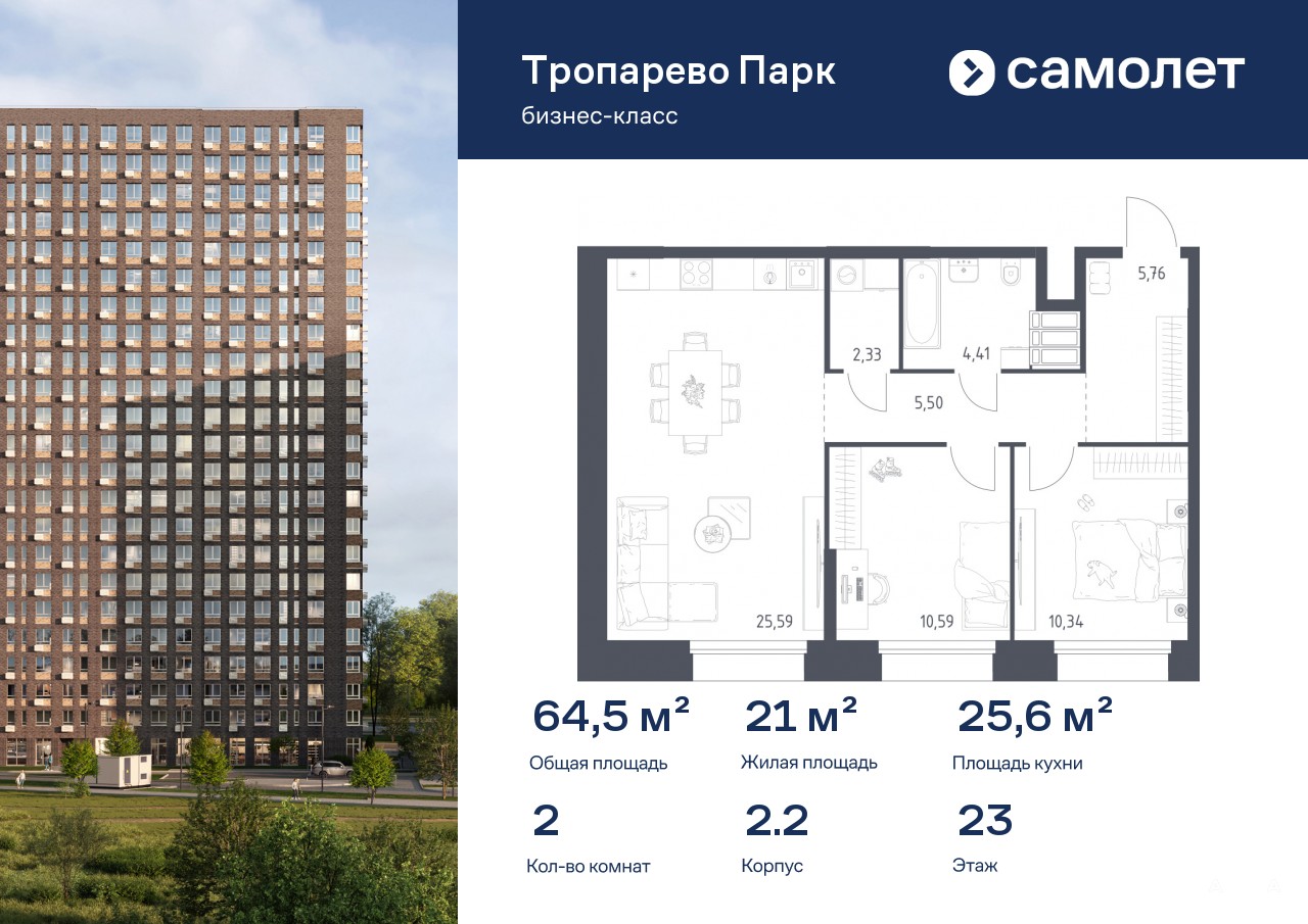 Строим кварталы для жизни с заботой о будущем. Предлагаются 2-комнатные апартаменты бизнес-класса 64, 52 кв.м в корпусе 2.2 на 23 этаже, в МФК «Тропарево Парк»