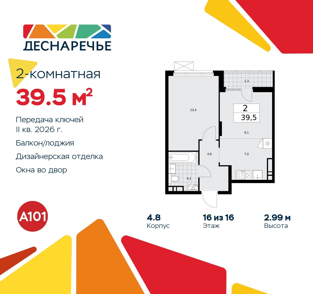 Просторная 2-комн. квартира с европланировкой и отделкой в ЖК "Деснаречье" на 16 этаже. Общая площадь: 39.5 кв.м., жилая: 22.5 кв.м., общая площадь гостиной-столовой с кухонной зоной: 16.1 кв.м. Европланировка, за счет большой площади кухни-гостиной квартира выглядит просторной и очень удобна для жизни. Комнаты изолированные, все окна выходят на одну сторону. В квартире одна лоджия, один совмещенный санузел. Высота потолков 2.99 м.