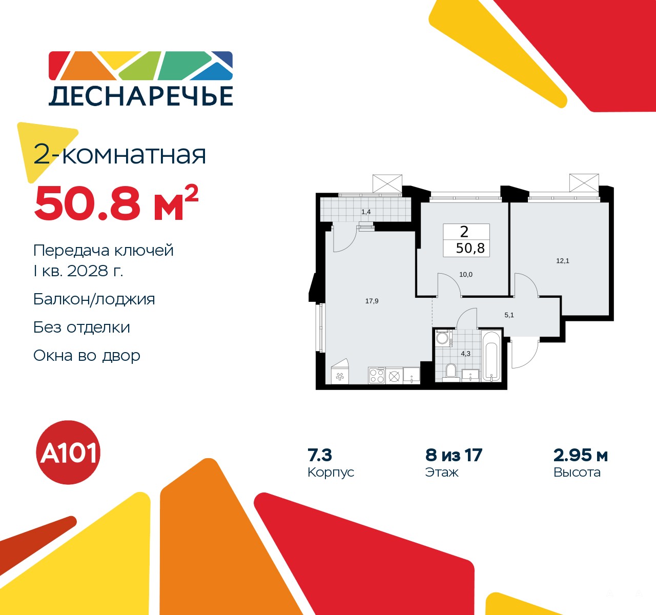 Продается двухкомнатная квартира в ЖК "Деснаречье" на 8 этаже. Квартира без отделки, после оформления собственности можно делать ремонт. Общая площадь: 50.8 кв.м., жилая: 22.1 кв.м., площадь просторной кухни-столовой: 17.9 кв.м. Квартира угловая, окна oбecпeчивaют paвнoмepнoe ocвeщeниe в тeчeниe дня. В квартире одна лоджия, один совмещенный санузел. Высота потолков 2.95 м.