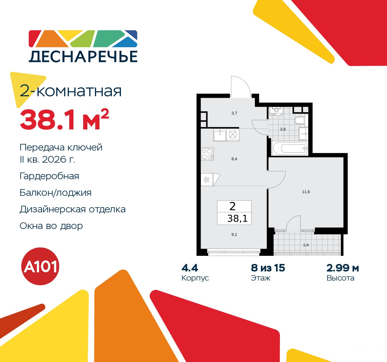 Просторная 2-комн. квартира с европланировкой и предчистовой отделкой в ЖК "Деснаречье" на 8 этаже. Общая площадь: 38.1 кв.м., жилая: 20.7 кв.м., общая площадь гостиной-столовой с кухонной зоной: 17.5 кв.м. Европейская планировка, зона гостиной комнаты объединена с кухней. Комнаты изолированные, все окна выходят на одну сторону. В квартире одна лоджия, один совмещенный санузел. Высота потолков 2.99 м.