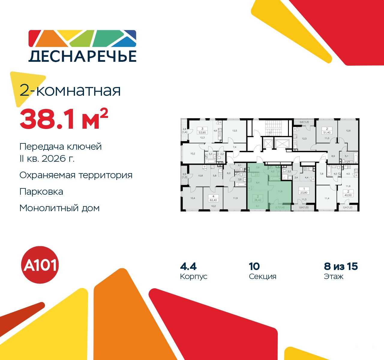 Дом монолитный, черырехподъездный, высотой 15 этажей. Квартира находится в 1-й секции в корпусе 4.4. На этаже 6 квартир. В подъезде 1 пассажирский и 1 грузовой лифт. Начало строительства - 3 квартал 2023 года. Окончание строительства - 2 квартал 2026 года. Оформление сделки по договору долевого участия.