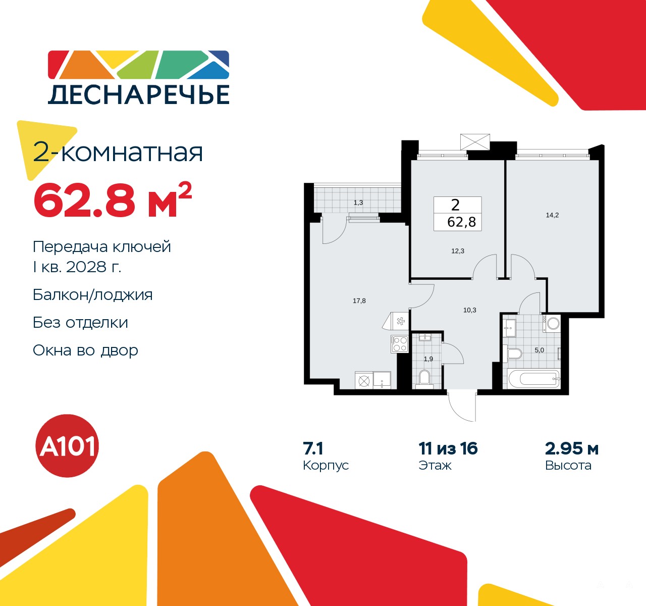 Продается 2-комн. квартира от застройщика в ЖК "Деснаречье" на 11 этаже. Квартира без отделки, полностью готова к ремонту. Общая площадь: 62.8 кв.м., жилая: 26.5 кв.м., площадь просторной кухни-столовой: 17.8 кв.м. Комнаты изолированные, все окна выходят на одну сторону. В квартире одна лоджия, один совмещенный и один раздельный санузел. Высота потолков 2.95 м.
